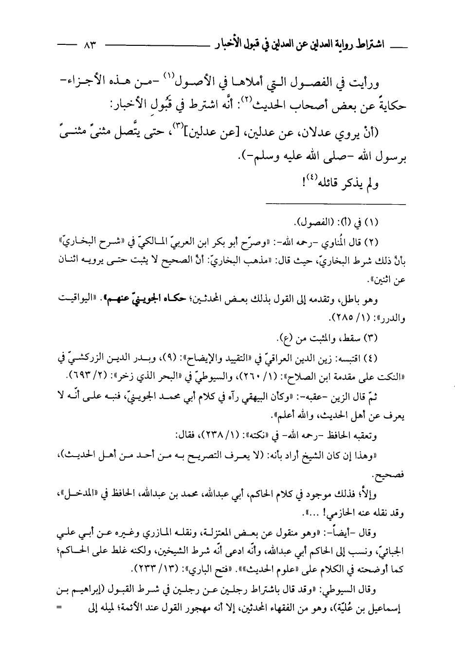 (أن يروي عدلان، عن عدلين، [عن عدلين] ، حتى يتصل مثنىً مثنىً برسول الله - صلى الله عليه وسلم -)