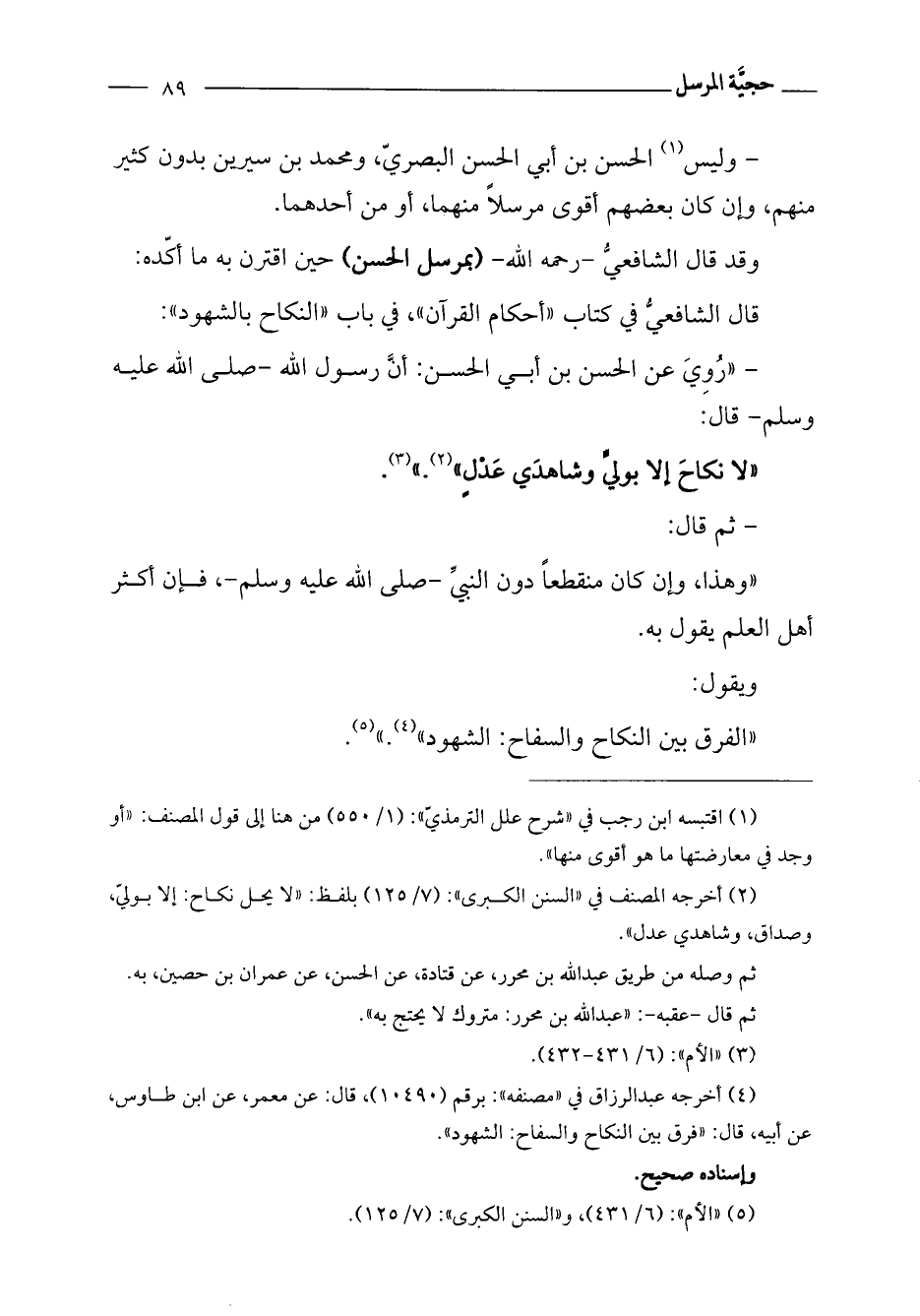 وقد قال الشافعي -رحمه الله- (بمرسل الحسن) حين اقترن به ما أكده: