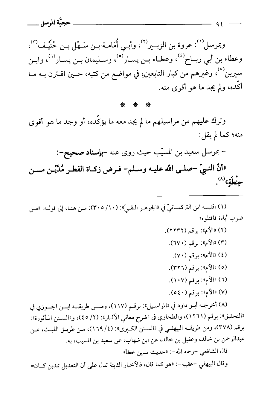 - بمرسل سعيد بن المسيب حيث روى عنه -بإسناد صحيح-: