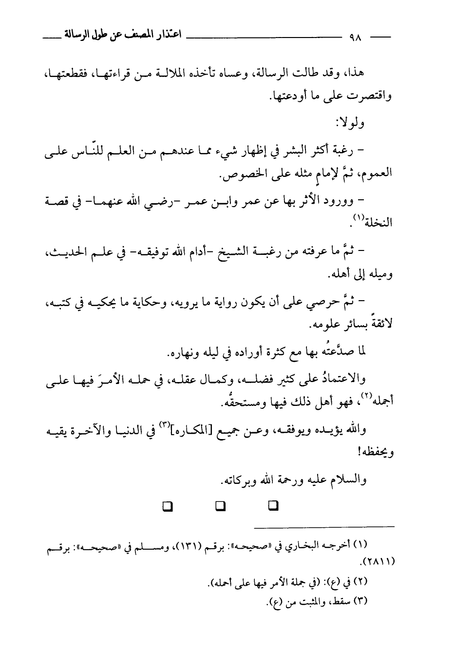 هذا، وقد طالت الرسالة، وعساه تأخذه الملالة من قراءتها، فقطعتها، واقتصرت على ما أودعتها.