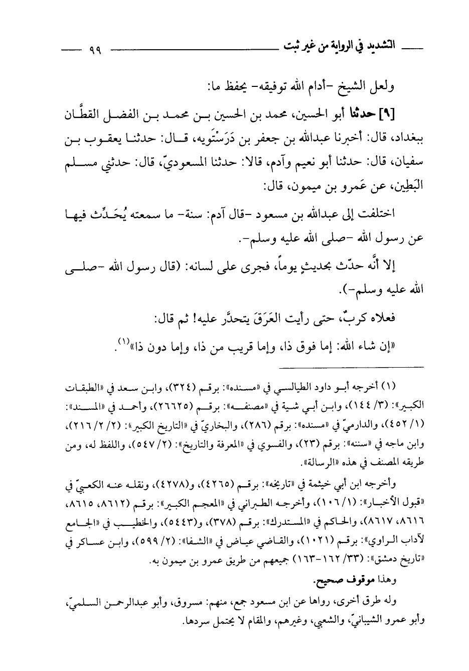 9- حدثنا أبو الحسين، محمد بن الحسين بن محمد بن الفضل القطان ببغداد، قال: أخبرنا عبد الله بن جعفر بن درستويه، قال: حدثنا يعقوب بن سفيان قال: حدثنا أبو نعيم وآدم، قالا: حدثنا المسعودي، قال: حدثني مسلم البطين، عن عمرو بن ميمون، قال: