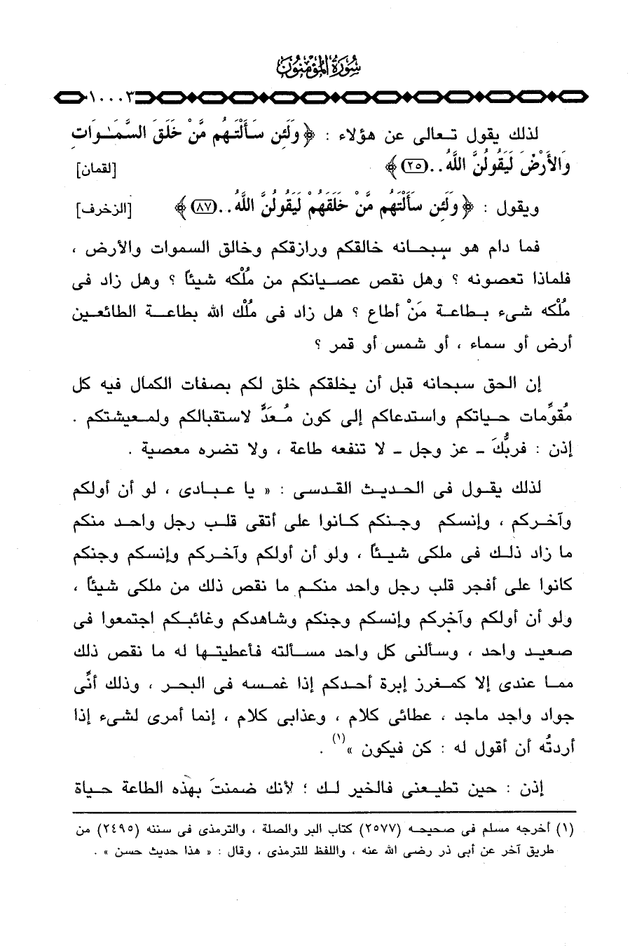 لذلك يقول في الحديث القدسي: «يا عبادي، لو أن أولكم وآخركم، وإنسكم وجنكم كانوا على أتقى قلب رجل واحد منكم ما زاد ذلك في ملكي شيئاً، ولو أن أولكم وآخركم وإنسكم وجنكم كانوا على أفجر قلب رجل واحد منكم ما نقص ذلك من ملكي شيئاً، ولو أن أولكم وآخركم وإنسكم وجنكم وشاهدكم وغائبكم اجتمعوا في صعيد واحد، وسألني كل واحد مسألته فأعطيتها له ما نقص ذلك مما عندي إلا كمغرز إبرة أحدكم إذا غمسه في البحر، وذلك أنِّي جواد واجد ماجد، عطائي كلام، وعذابي كلام، إنما أمري لشيء إذا أردتُه أن أقول له: كن فيكون» .