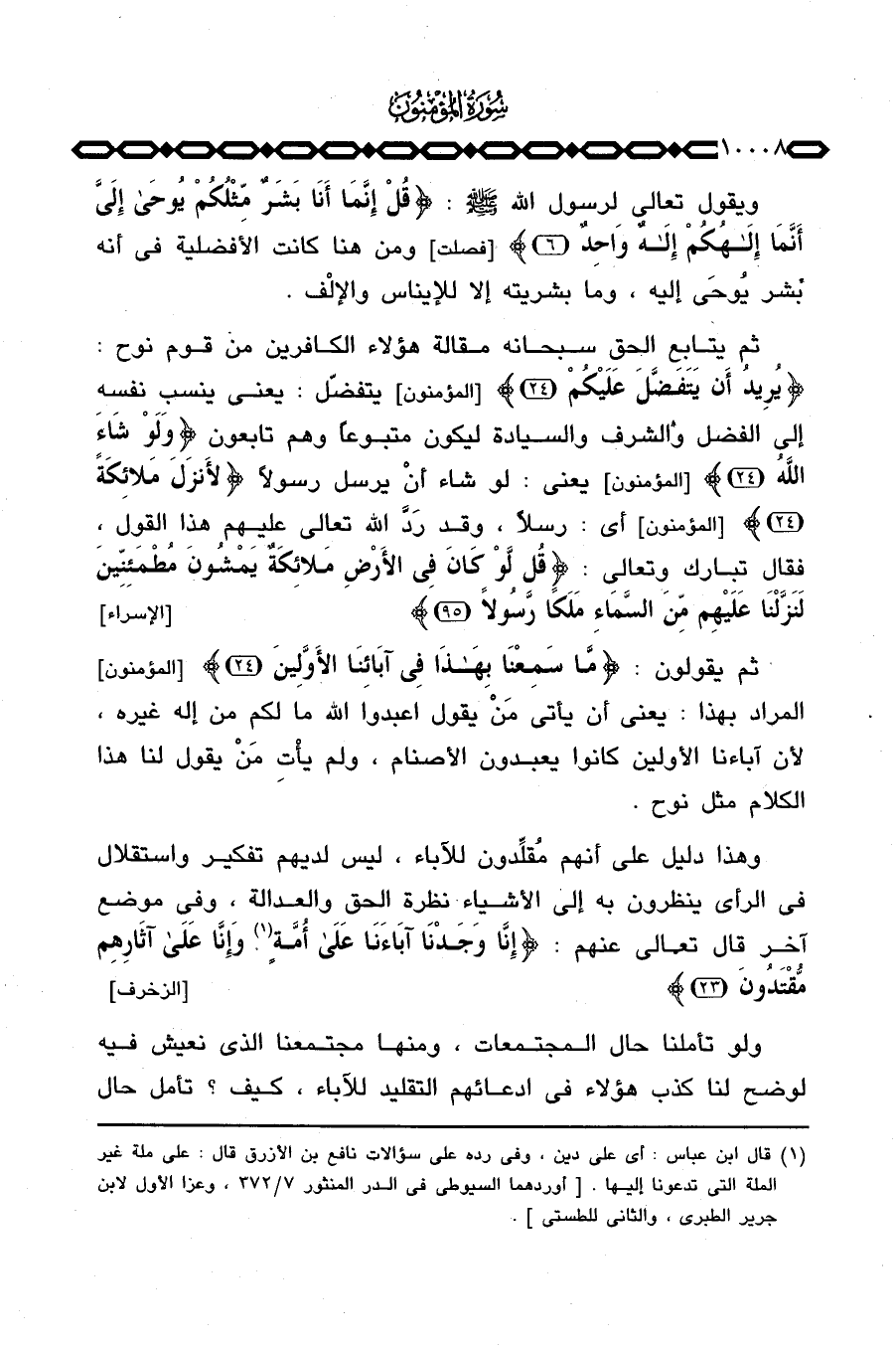 ثم يتابع الحق سبحانه مقالة هؤلاء الكافرين من قوم نوح: {يُرِيدُ أَن يَتَفَضَّلَ عَلَيْكُمْ} [المؤمنون: 24] يتفضّل: يعني ينسب نفسه إلى الفضل والشرف والسيادة ليكون متبوعاً وهم تابعون {وَلَوْ شَآءَ الله} [المؤمنون: 24] يعني: لو شاء أنْ يرسل رسولاً {لأَنزَلَ مَلاَئِكَةً} [المؤمنون: 24] أي: رسلاً، وقد رَدَّ الله تعالى عليهم هذا القول، فقال تبارك وتعالى: {قُل لَوْ كَانَ فِي الأرض ملائكة يَمْشُونَ مُطْمَئِنِّينَ لَنَزَّلْنَا عَلَيْهِم مِّنَ السمآء مَلَكاً رَّسُولاً} [الإسراء: 95] .