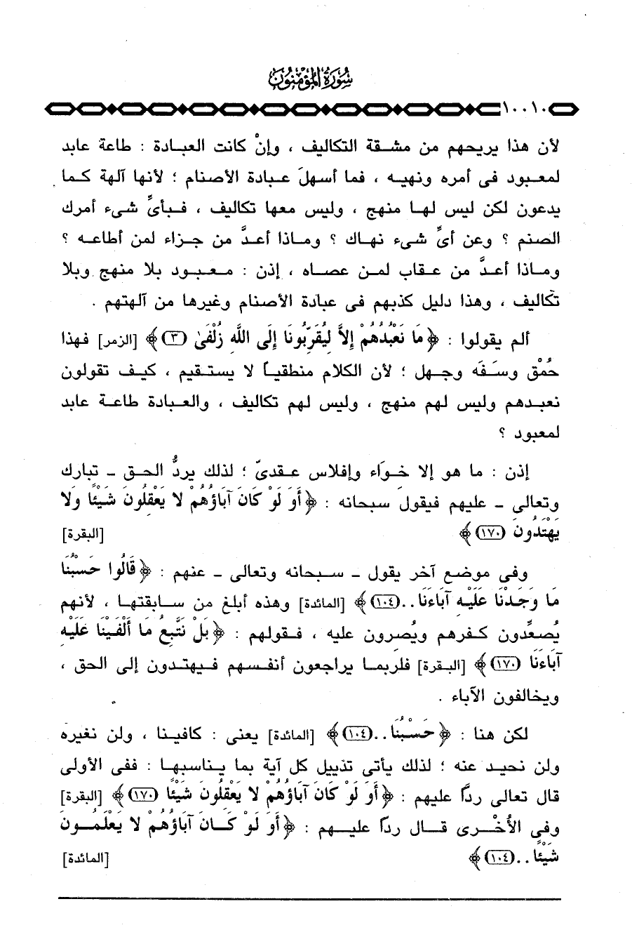 الم يقولوا: {مَا نَعْبُدُهُمْ إِلاَّ لِيُقَرِّبُونَآ إِلَى الله زلفى} [الزمر: 3] فهذا حُمْق وسَفَه وجهل؛ لأن الكلام منطقياً لا يستقيم، كيف تقولون نعبدهم وليس لهم منهج، وليس لهم تكاليف، والعبادة طاعة عابد لمعبود؟