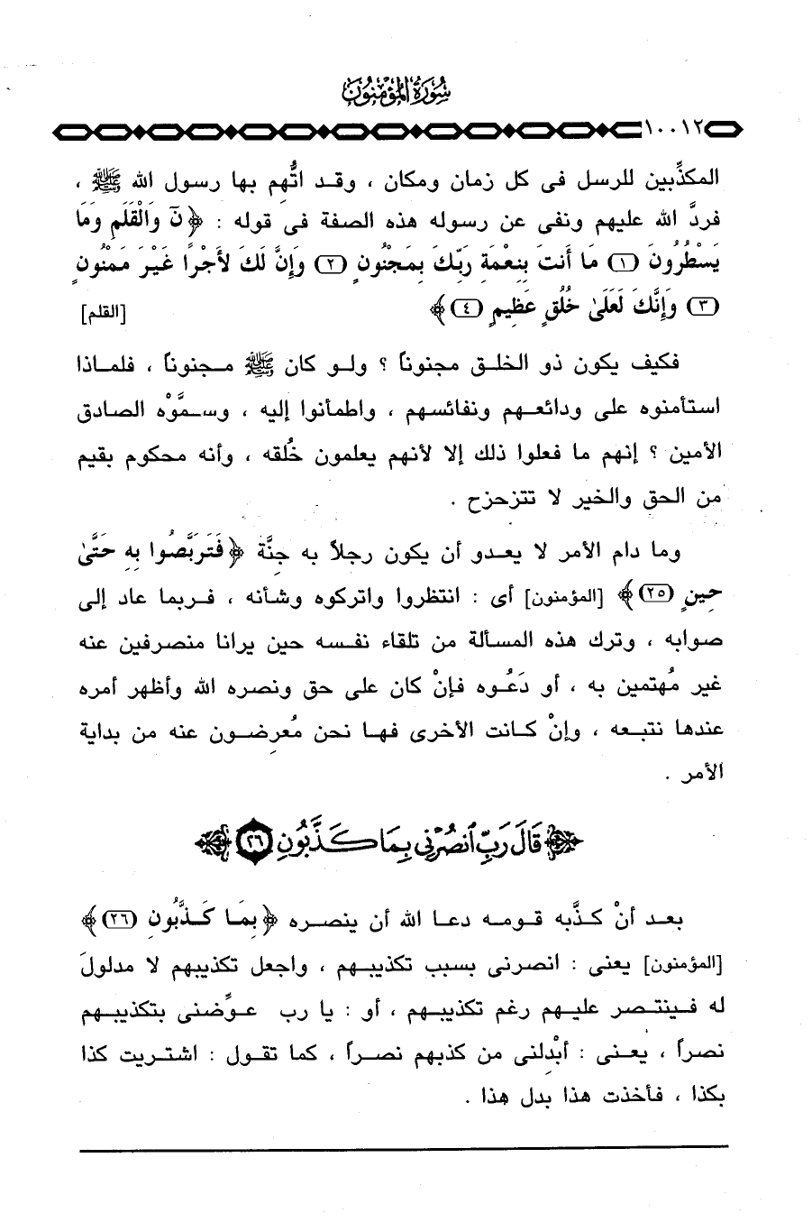 بعد أنْ كذَّبه قومه دعا الله ان ينصره {بِمَا كَذَّبُونِ} [المؤمنون: 26] يعني: انصرني بسبب تكذيبهم، واجعل تكذيبهم لا مدلولَ له فينتصر عليهم رغم تكذيبهم، أو: يا رب عوِّضني بتكذيبهم نصراً، يعني: أبْدِلني من كذبهم نصراً، كما تقول: اشتريت كذا بكذا، فأخذت هذا بدل هذا.
