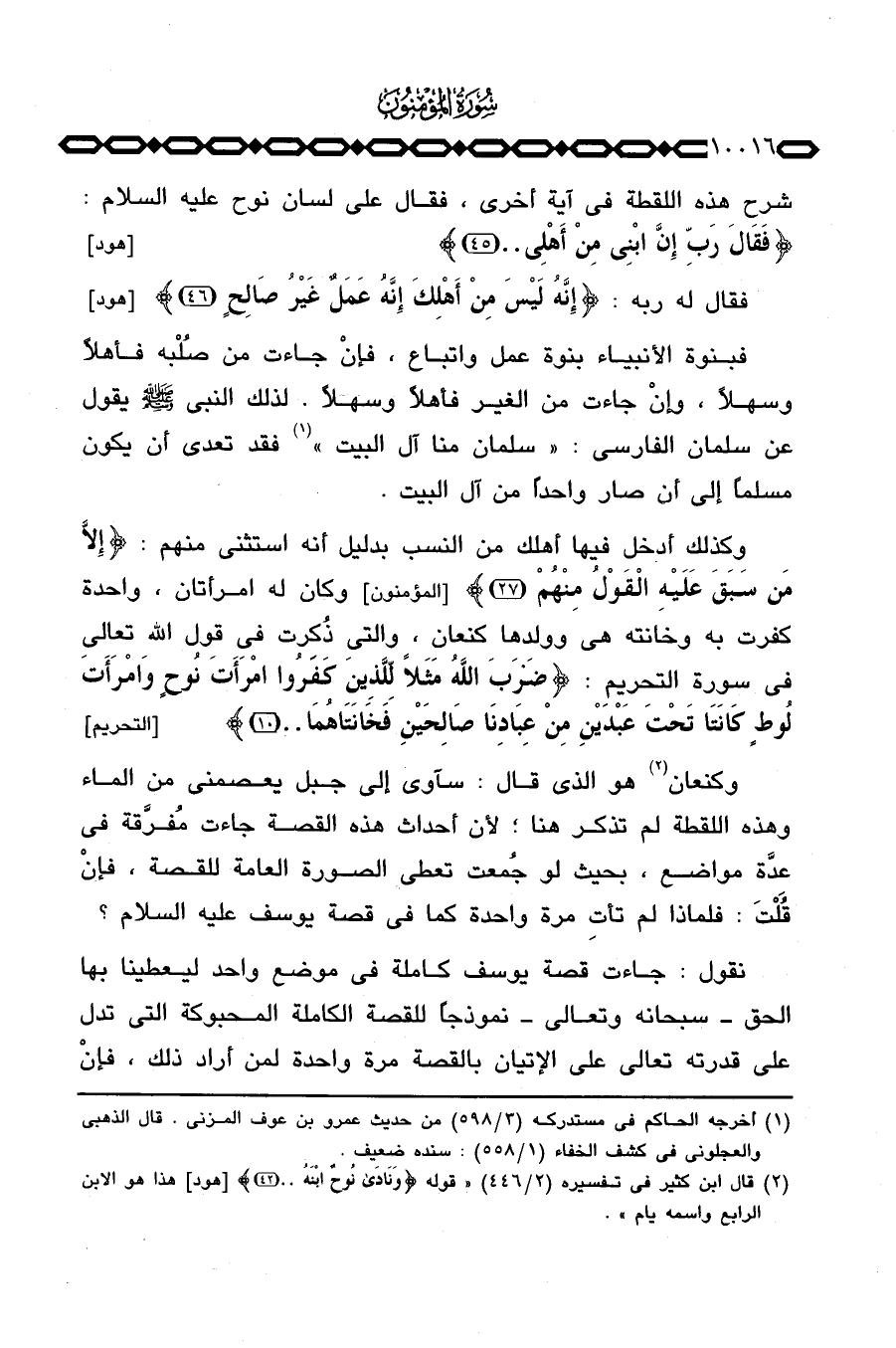 وكذلك أدخل فيها أهلك من النسب بدليل أنه استثنى منهم: {إِلاَّ مَن سَبَقَ عَلَيْهِ القول مِنْهُمْ} [المؤمنون: 27] وكان له امرأتان، واحدة كفرت به وخانته هي وولدها كنعان، والتي ذُكرت في قول الله تعالى في سورة التحريم: {ضَرَبَ الله مَثَلاً لِّلَّذِينَ كَفَرُواْ امرأت نُوحٍ وامرأت لُوطٍ كَانَتَا تَحْتَ عَبْدَيْنِ مِنْ عِبَادِنَا صَالِحَيْنِ فَخَانَتَاهُمَا. .} [التحريم: 10] .