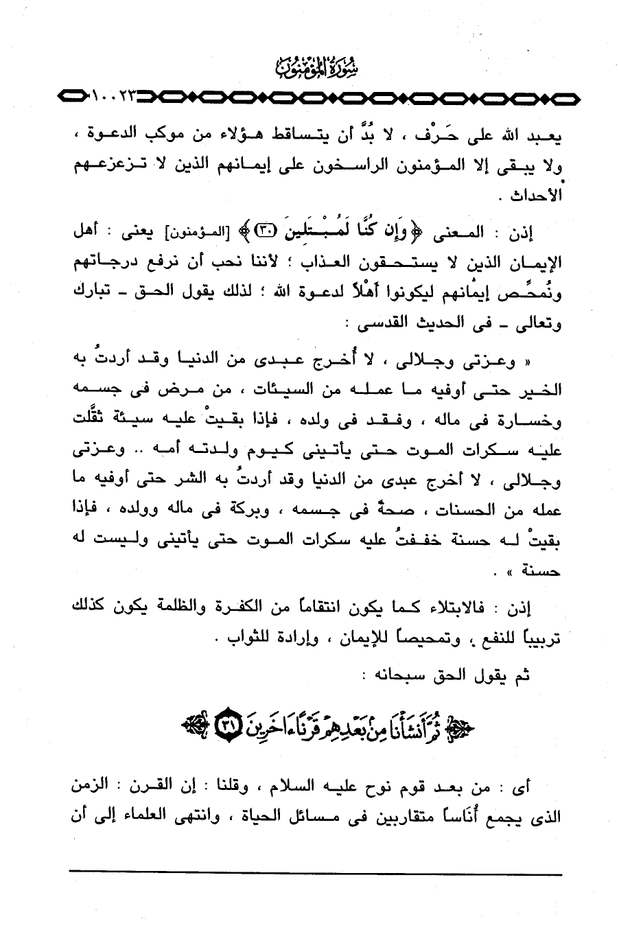 إذن: المعنى {وَإِن كُنَّا لَمُبْتَلِينَ} [المؤمنون: 30] يعني: أهل الإيمان الذين لا يستحقون العذاب؛ لأننا نحب أن نرفع درجاتهم ونُمحِّص إيمانهم ليكونوا أَهْلاً لدعوة الله؛ لذلك يقول الحق - تبارك وتعالى - في الحديث القدسي: «وعزتي وجلالي، لا أُخرج عبدي من الدنيا وقد أردتُ به الخير حتى أوفيه ما عمله من السيئات، من مرض في جسمه وخسارة في ماله، وفقد في ولده، فإذا بقيتْ عليه سيئة ثقَّلت عليه سكرات الموت حتى يأتيني كيوم ولدته أمه. . وعزتي وجلالي، لا أخرج عبدي من الدنيا وقد أردتُ به الشر حتى أوفيه ما عمله من الحسنات، صحةً في جسمه، وبركة في ماله وولده، فإذا بقيتْ له حسنة خففتُ عليه سكرات الموت حتى يأتيني وليست له حسنة» .