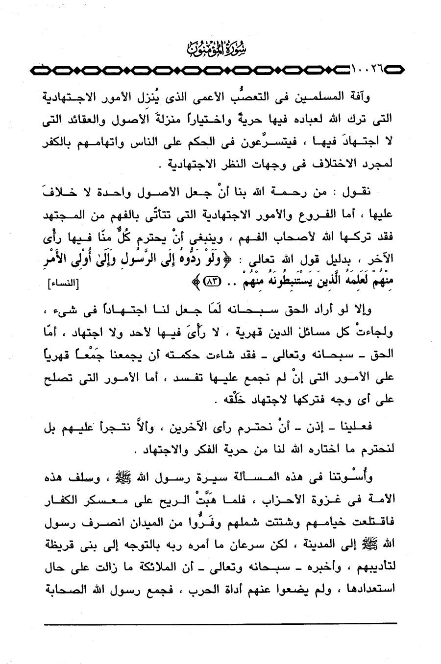 وآفة المسلمين في التعصُّب الأعمى الذي يُنزِل الأمور الاجتهادية التي ترك الله لعباده فيه حريةً واختياراً منزلةَ الأصول والعقائد التي لا اجتهادَ فيها، فيتسرَّعون في الحكم على الناس واتهامهم بالكفر لمجرد الاختلاف في وجهات النظر الاجتهادية.