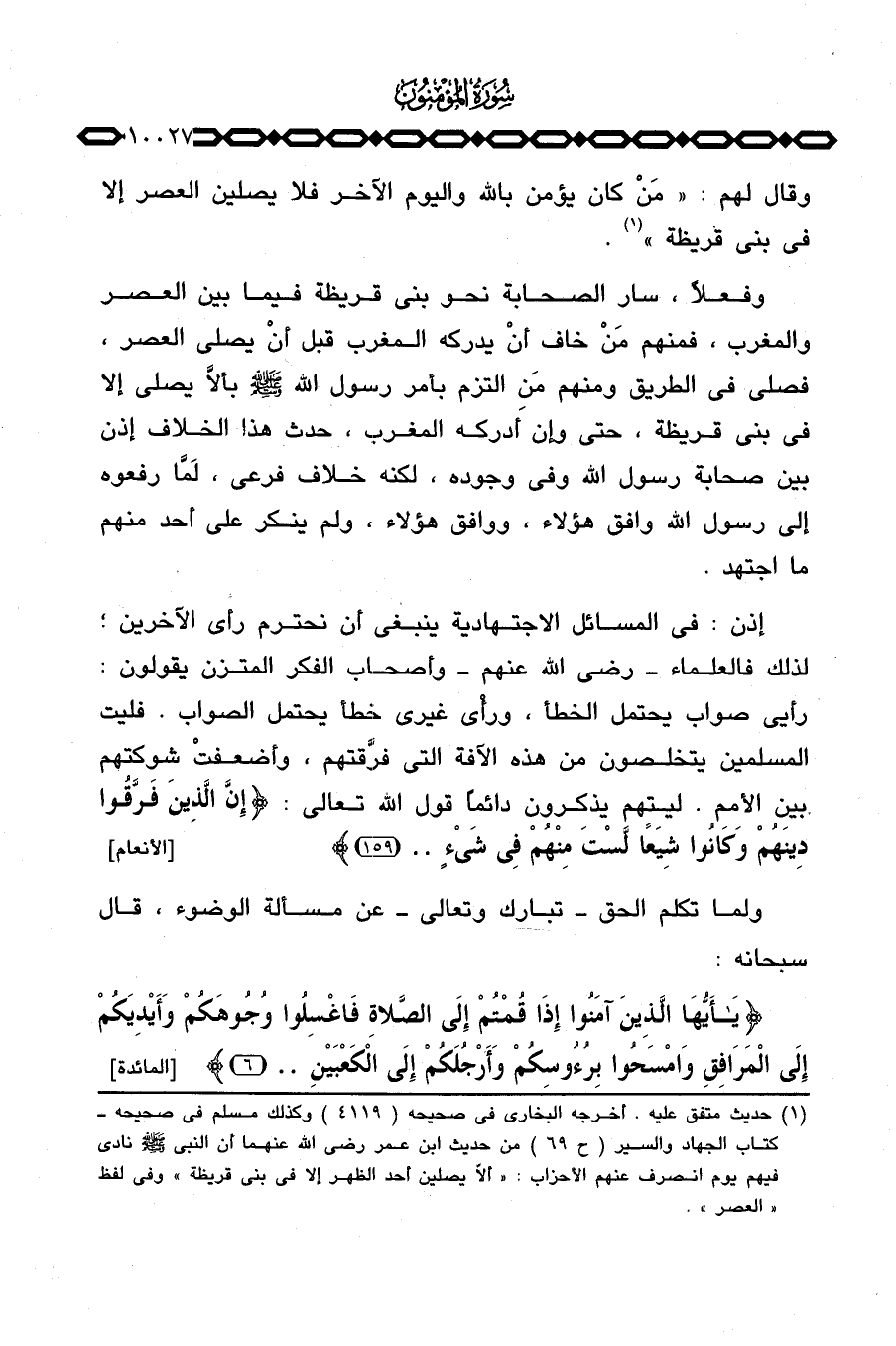 وفعلاً، سار الصحابة نحو بني قريظة فيما بين العصر والمغرب، فمنهم مَنْ خاف أنْ يدركه المغرب قبل أنْ يصلي العصر، فصلى في الطريق ومنهم مَن التزم بأمر رسول الله صَلَّى اللَّهُ عَلَيْهِ وَسَلَّم َ بألاَّ يصلي إلا في بني قريظة، حتى وإن أدركه المغرب، حدث هذا الخلاف إذن بين صحابة رسول الله وفي وجوده، لكنه خلاف فرعي، لَمَّا رفعوه إلى رسول الله وافق هؤلاء، ووافق هؤلاء، ولم ينكر على أحد منهم ما اجتهد.