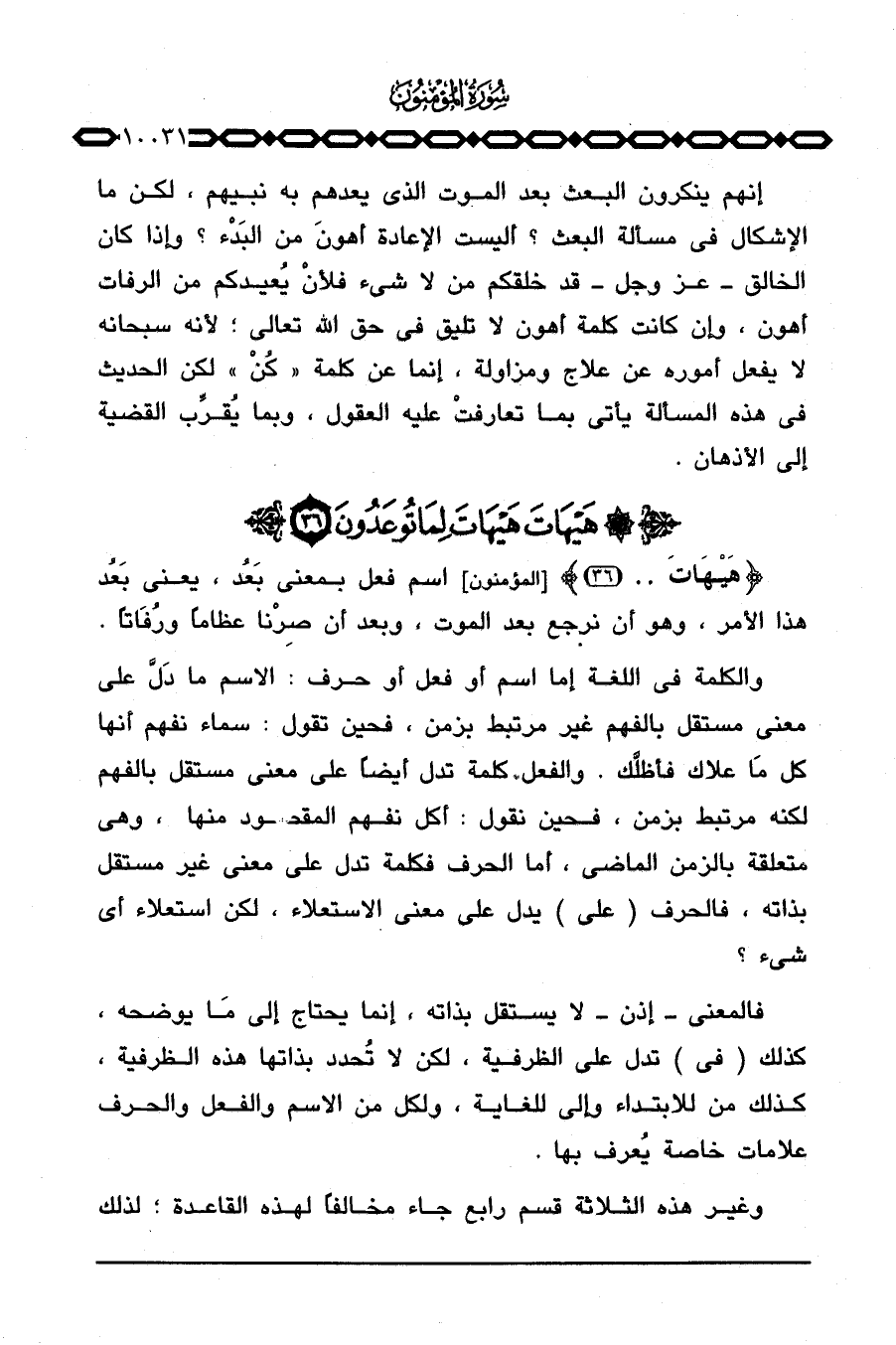 {هَيْهَاتَ. .} [المؤمنون: 36] اسم فعل بمعنى بَعُد، يعني بَعُد هذا الأمر، وهو أن نرجع بعد الموت، وبعد أن صِرْنا عظاماً ورُفَاتاً.