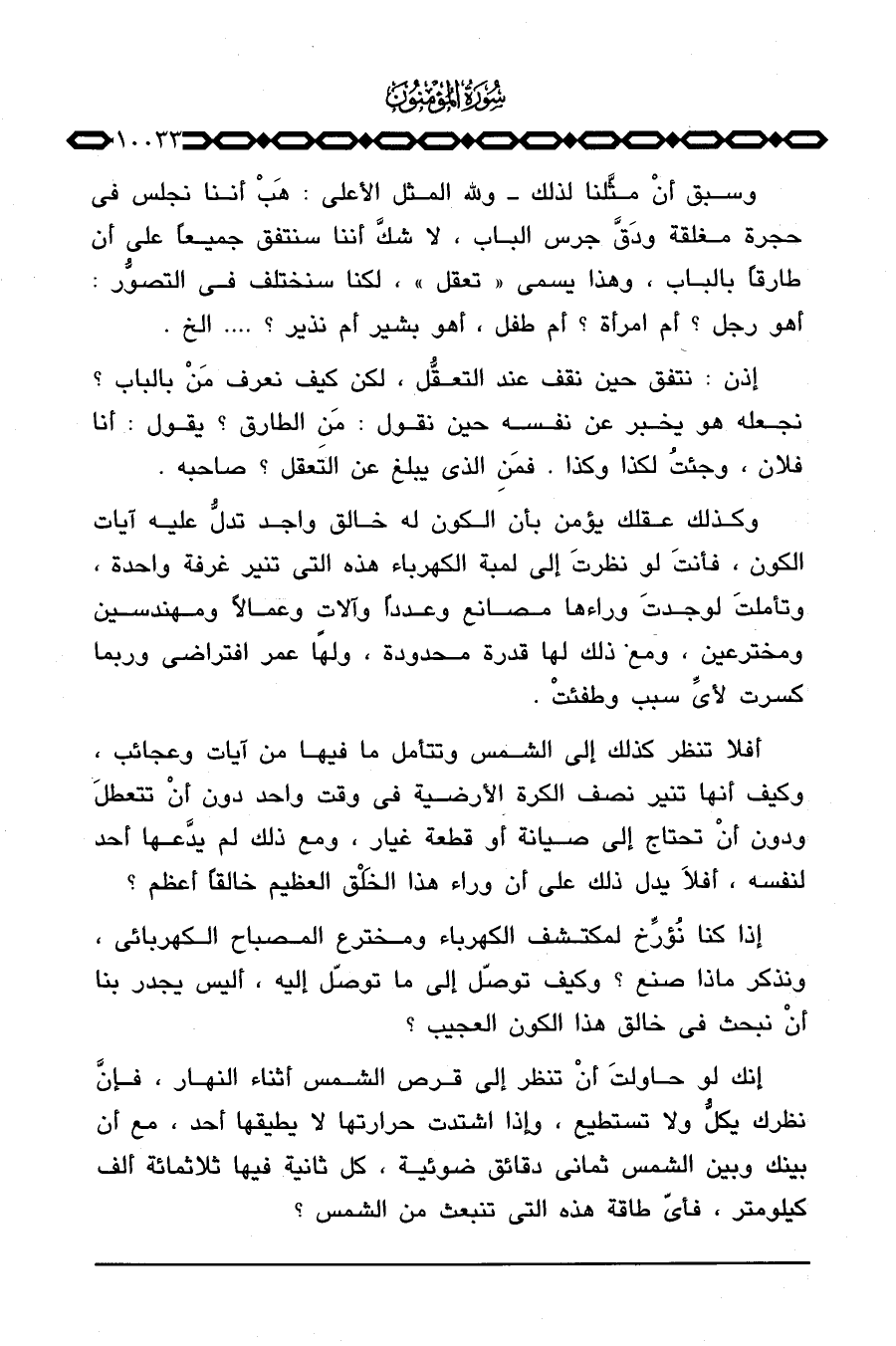 وكذلك عقلك يؤمن بأن الكون له خالق واحد تدلُّ عليه آيات الكون، فأنتَ لو نظرتَ إلى لمبة الكهرباء هذه التي تنير غرفة واحدة، وتأملَ لوجدتَ وراءها مصانع وعدداً وآلات وعمالاً ومهندسين ومخترعين، ومع ذلك لها قدرة محدودة، ولهّا عمر افتراضي وربما كسرت لأيِّ سبب وطفئتْ.