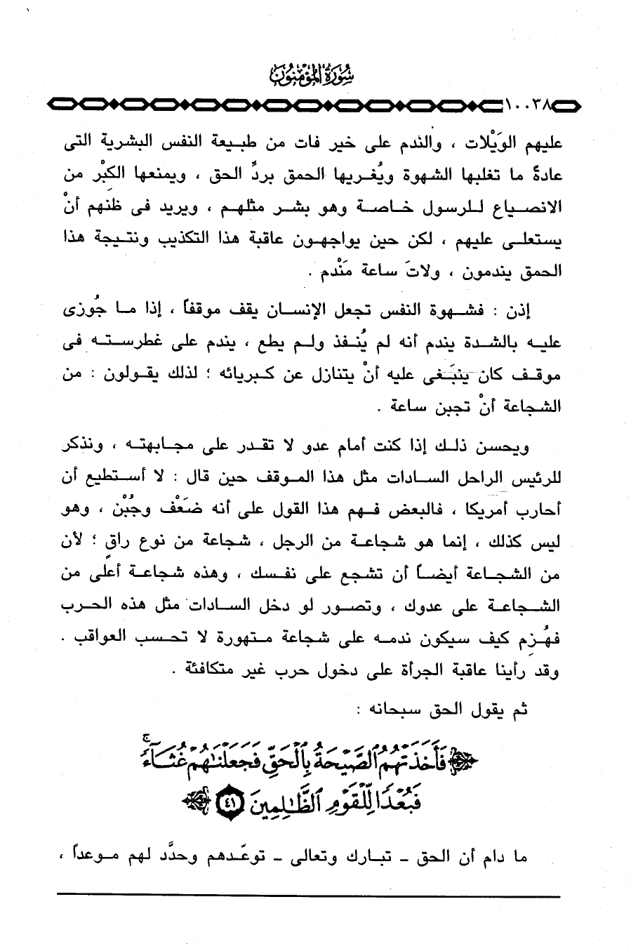 ويحسن ذلك إذا كنت أمام عدو لا تقدر على مجابهته، ونذكر للرئيس الراحل السادات مثل هذا الموقف حين قال: لا أستطيع أن أحارب أمريكا، فالبعض فهم هذا القول على أنه ضَعْف وجُبْن، وهو ليس كذلك، إنما هو شجاعة من الرجل، شجاعة من نوع راقٍ؛ لأن من الشجاعة أيضاً أن تشجع على نفسك، وهذه شجاعة أعلى من الشجاعة على عدوك، وتصور لو دخل السادات مثل هذه الحرب فهُزِم كيف سيكون ندمه على شجاعة متهورة لا تحسب العواقب. وقد رأينا عاقبة الجرأة على دخول حرب غير متكافئة.