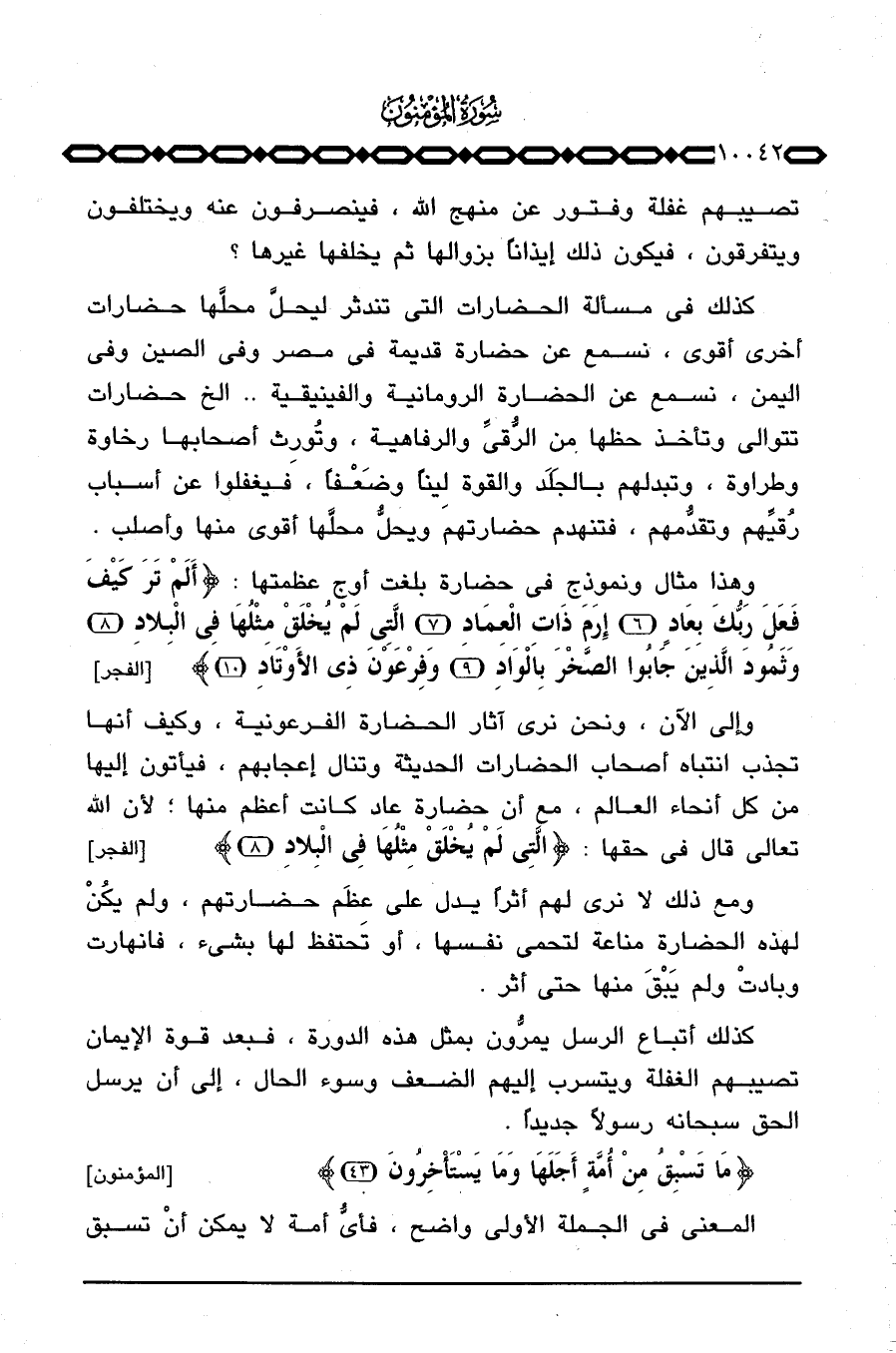 كذلك في مسألة الحضارات التي تندثر ليحلَّ محلَّها حضارات أخرى أقوى، نسمع عن حضارة قديمة في مصر وفي الصين وفي اليمن، نسمع عن الحضارة الرومانية والفينيقية. . الخ حضارات تتوالى وتأخذ حظها من الرُّقيِّ والرفاهية، وتُورِث أصحابها رخاوة وطراوة، وتبدلهم بالجَلَد والقوة لِيناً وضَعْفاً، فيغفلوا عن أسباب رُقيِّهم وتقدُّمهم، فتنهدم حضارتهم ويحلُّ محلَّها أقوى منها وأصلب.