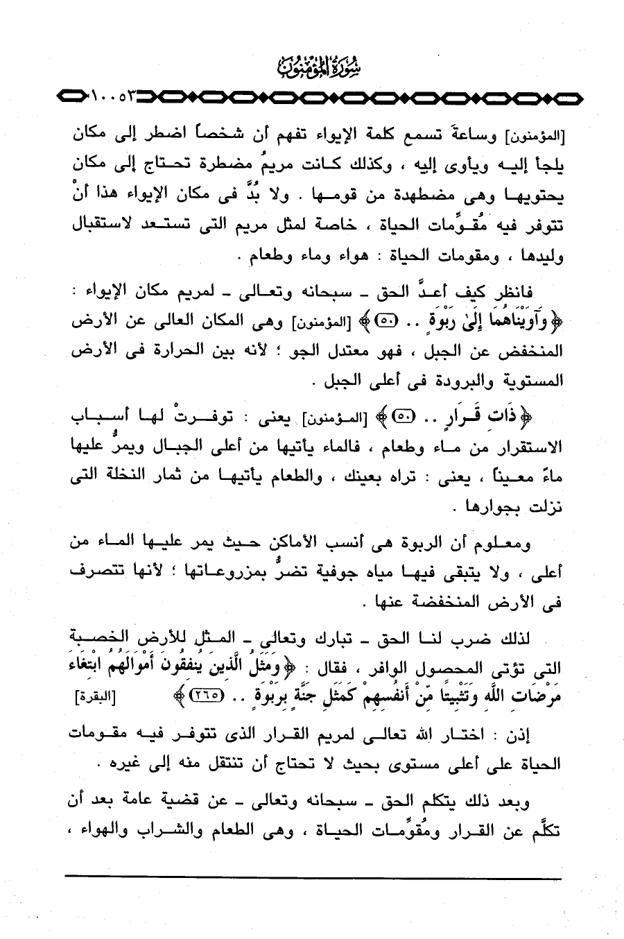 {ذَاتِ قَرَارٍ. .} [المؤمنون: 50] يعني: توفرتْ لها أسباب الاستقرار من ماء وطعام، فالماء يأتيها من أعلى الجبال ويمرُّ عليها ماءً معيناً، يعني: تراه بعينك، والطعام يأتيها من ثمار النخلة التي نزلت يجوارها.