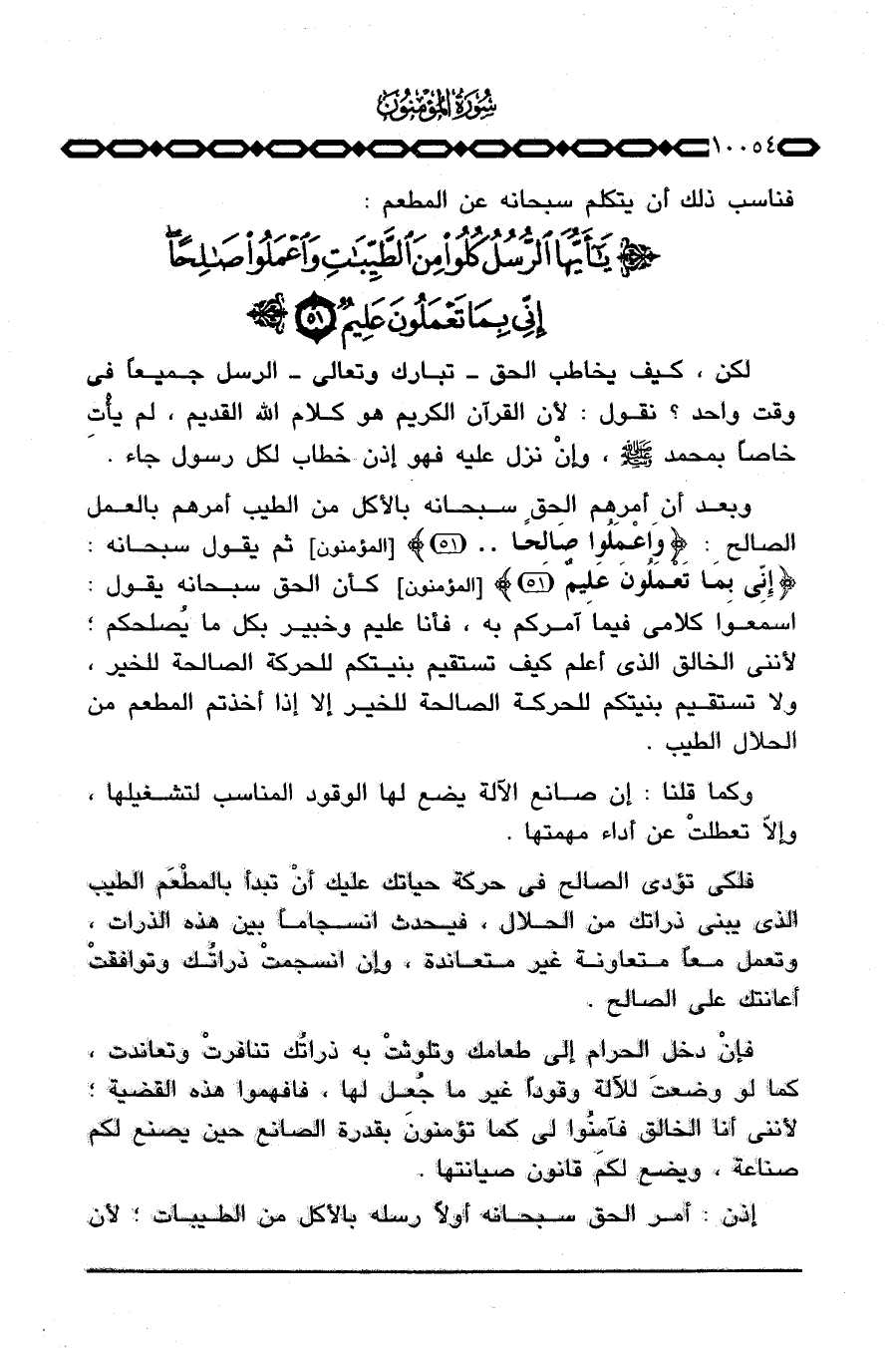 وبعد أن أمرهم الحق سبحانه بالأكل من الطيب أمرهم بالعمل الصالح: {واعملوا صَالِحاً. .} [المؤمنون: 51] ثم يقول سبحانه: {إِنِّي بِمَا تَعْمَلُونَ عَلِيمٌ} [المؤمنون: 51] كأن الحق سبحانه يقول: اسمعوا كلامي فيما آمركم به، فأنا عليم وخبير بكل ما يُصلحكم؛ لأنني الخالق الذي أعلم كيف تستقيم بنيتكم للحركة الصالحة للخير، ولا تستقيم بنيتكم للحركة الصالحة للخير إلا إذا أخذتم المطعم من الحلال الطيب.