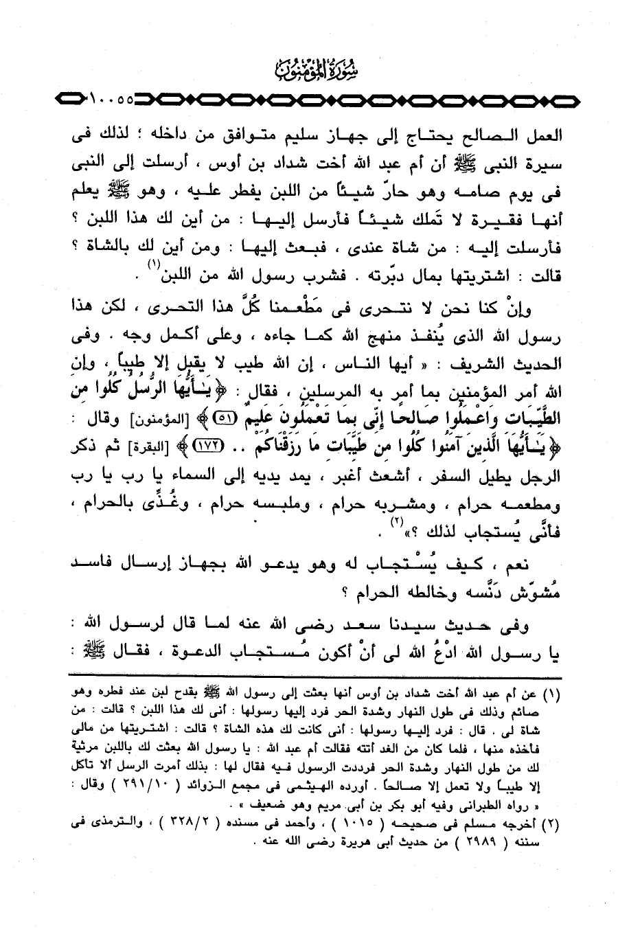 وإنْ كنا نحن لا نتحرى في مَطْعمنا كُلَّ هذا التحري، لكن هذا رسول الله الذي يُنفذ منهج الله كما جاءه، وعلى أكمل وجه. وفي الحديث الشريف: «أيها الناس، إن الله طيب لا يقبل إلا طيباً، وإن الله أمر المؤمنين بما أمر به المرسلين، فقال: {ياأيها الرسل كُلُواْ مِنَ الطيبات واعملوا صَالِحاً إِنِّي بِمَا تَعْمَلُونَ عَلِيمٌ} [المؤمنون: 51] وقال: {ياأيها الذين آمَنُواْ كُلُواْ مِن طَيِّبَاتِ مَا رَزَقْنَاكُمْ. .} [البقرة: 172] ثم ذكر الرجل يطيل السفر، أشعث أغبر، يمد يديه إلى السماء يا رب يا رب ومطعمه حرام، ومشربه حرام، وملبسه حرام، وغُذِّي بالحرام، فأنَّى يُستجاب لذلك؟» .