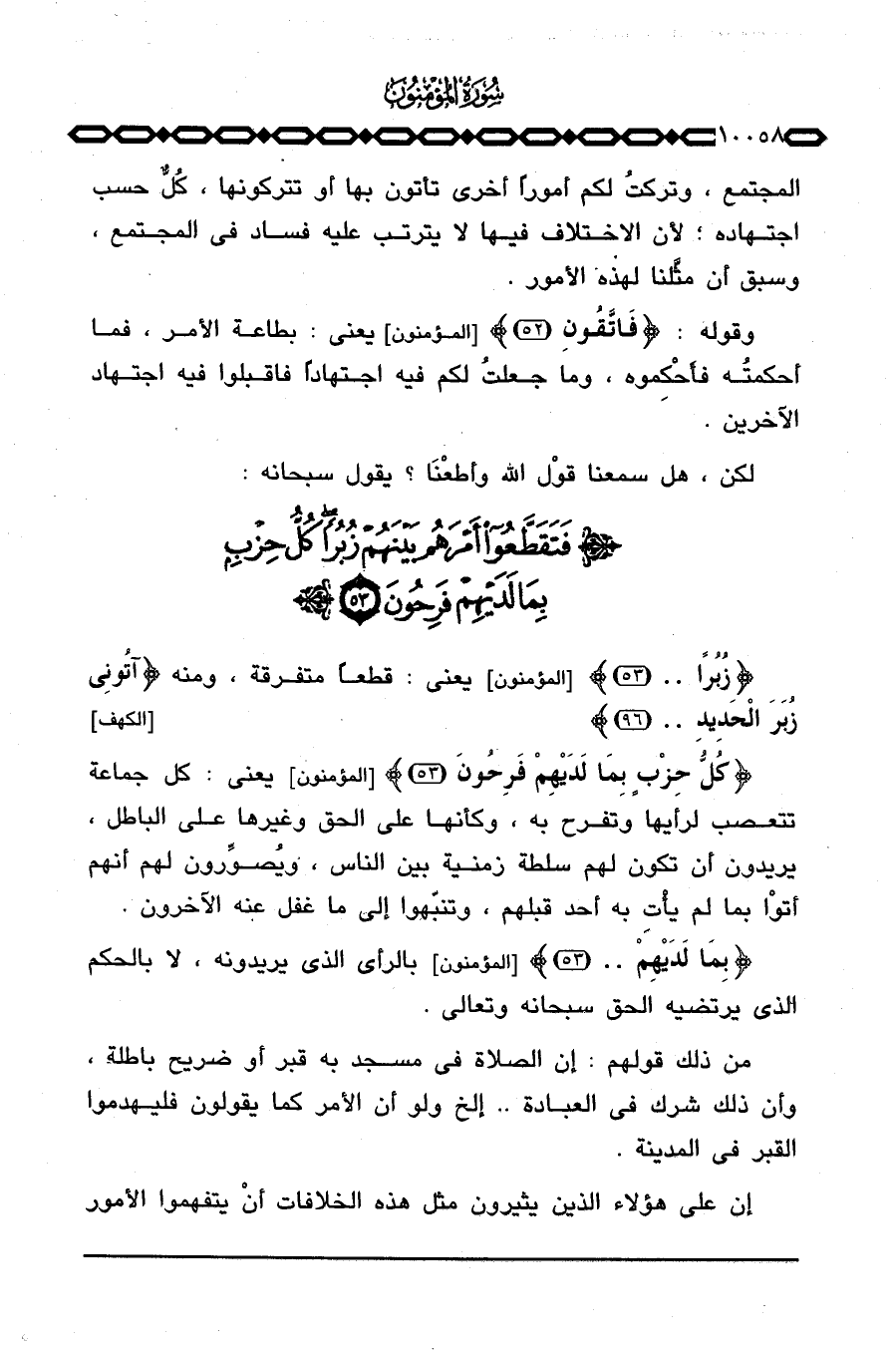 {زُبُراً} [المؤمنون: 53] يعني: قطعاً متفرقة، ومنه {آتُونِي زُبَرَ الحديد. .} [الكهف: 96] .