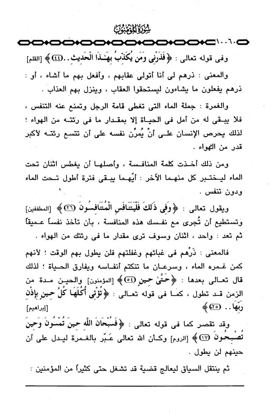فالمعنى: ذَرْهم في غبائهم وغفلتهم فلن يطول بهم الوقت؛ لأنهم كمن غمره الماء، وسرعان ما تنكتم أنفاسه ويفارق الحياة؛ لذلك قال تعالى بعدها: {حتى حِينٍ} [المؤمنون: 54] والحين مدة من الزمن قد تطول، كما في قوله تعالى: {تؤتي أُكُلَهَا كُلَّ حِينٍ بِإِذْنِ رَبِّهَا. .} [إبراهيم: 25] .
