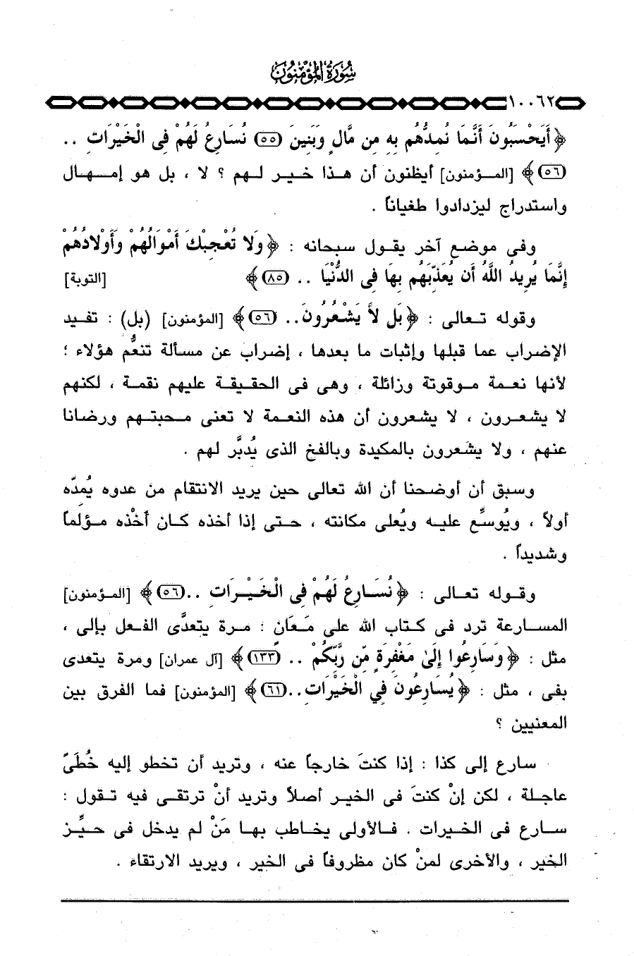 وقوله تعالى: {نُسَارِعُ لَهُمْ فِي الخيرات. .} [المؤمنون: 56] المسارعة ترد في كتاب الله على مَعَانٍ: مرة يتعدَّى الفعل بإلى، مثل: {وسارعوا إلى مَغْفِرَةٍ مِّن رَّبِّكُمْ. .} [آل عمران: 133] ومرة يتعدى بفي، مثل: {يُسَارِعُونَ فِي الخيرات. .} [المؤمنون: 61] فما الفرق بين المعنيين؟