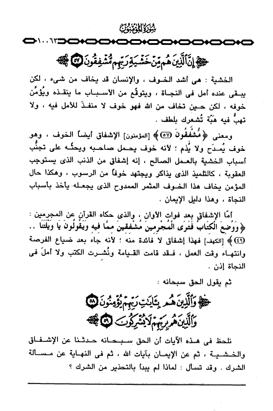 ومعنى {مُّشْفِقُونَ} [المؤمنون: 57] الإشفاق أيضاً الخوف، وهو خوف يُمدَح ولا يُذم؛ لأنه خوف يحمل صاحبه ويحثّه على تجنُّب أسباب الخشية بالعمل الصالح، إنه إشفاق من الذنب الذي يستوجب العقوبة، كالتلميذ الذي يذاكر ويجتهد خوفاً من الرسوب، وهكذا حال المؤمن يخاف هذا الخوف المثمر الممدوح الذي يجعله يأخذ بأسباب النجاة، وهذا دليل الإيمان.