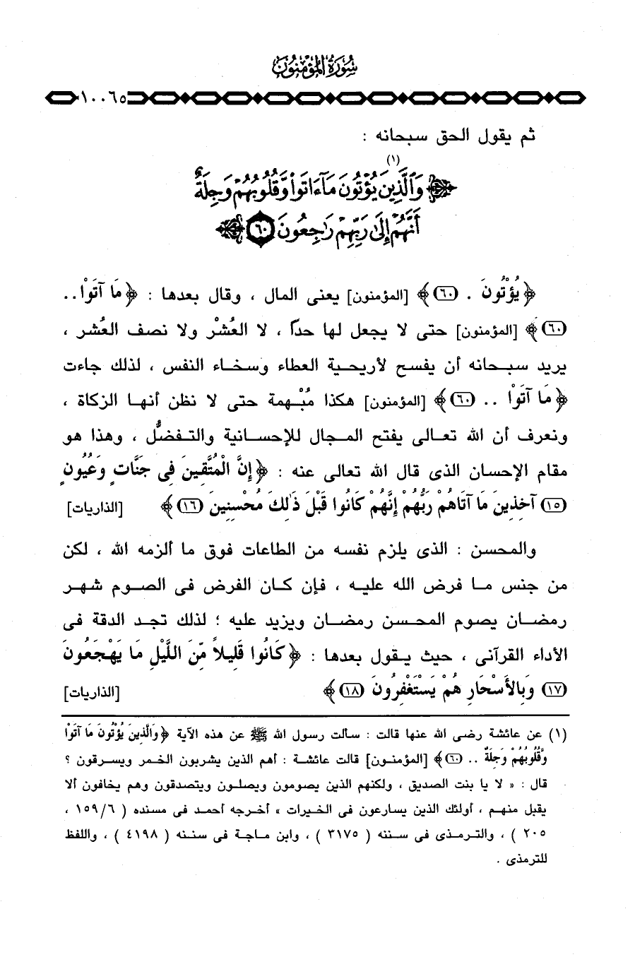 {يُؤْتُونَ. .} [المؤمنون: 60] يعني المال، وقال بعدها: {مَآ آتَواْ. .} [المؤمنون: 60] حتى لا يجعل لها حداً، لا العُشْر ولا نصف العُشر، يريد سبحانه أن يفسح لأريحية العطاء وسخاء النفس، لذلك جاءت {مَآ آتَواْ. .} [المؤمنون: 60] هكذا مُبْهمة حتى لا نظن أنها الزكاة، ونعرف أن الله تعالى يفتح المجال للإحسانية والتفضُّل، وهذا هو مقام الإحسان الذي قال الله تعالى عنه: {إِنَّ المتقين فِي جَنَّاتٍ وَعُيُونٍ آخِذِينَ مَآ آتَاهُمْ رَبُّهُمْ إِنَّهُمْ كَانُواْ قَبْلَ ذَلِكَ مُحْسِنِينَ} [الذاريات: 15 - 16] .
