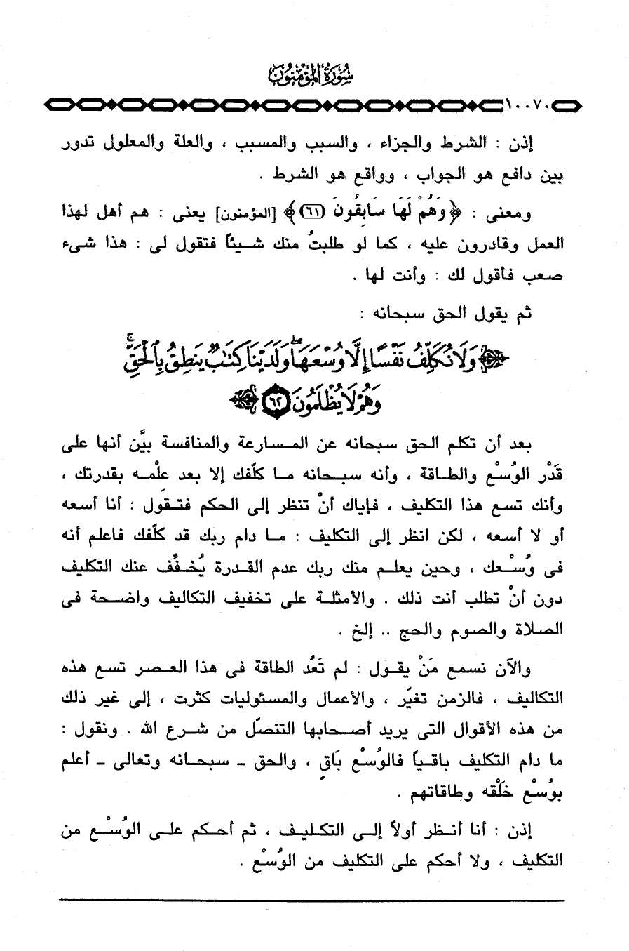 بعد أن تكلم الحق سبحانه عن المسارعة والمنافسة بيَّن أنها على قَدْر الوُسْع والطاقة، وأنه سبحانه ما كلّفك إلا بعد عِلْمه بقدرتك، وأنك تسع هذا التكليف، فإياك أنْ تنظر إلى الحكم فتقول: أنا أسعه أو لا أسعه، لكن أنظر إلى التكليف: ما دام ربك قد كلّفك فاعلم أنه في وُسْعك، وحين يعلم منك ربك عدم القدرة يُخفِّف عنك التكليف دون أنْ تطلب أنت ذلك. والأمثلة على تخفيف التكاليف واضحة في الصلاة والصوم والحج. . الخ.