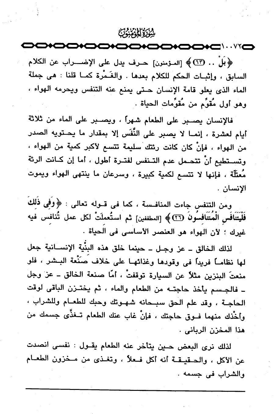 فالإنسان يصبر على الطعام شهراً، ويصبر على الماء من ثلاثة أيام لعشرة، إنما لا يصبر على النَّفَس إلا بمقدار ما يحتويه الصدر من الهواء، فإنْ كان كانت رئتك سليمة تتسع لأكبر كمية من الهواء، وتستطيع أنْ تتحمل عدم التنفس لفترة أطول، أما إن كانت الرئة مُعتَلّة، فإنها لا تتسع لكمية كبيرة، وسرعان ما ينتهي الهواء ويموت الإنسان.