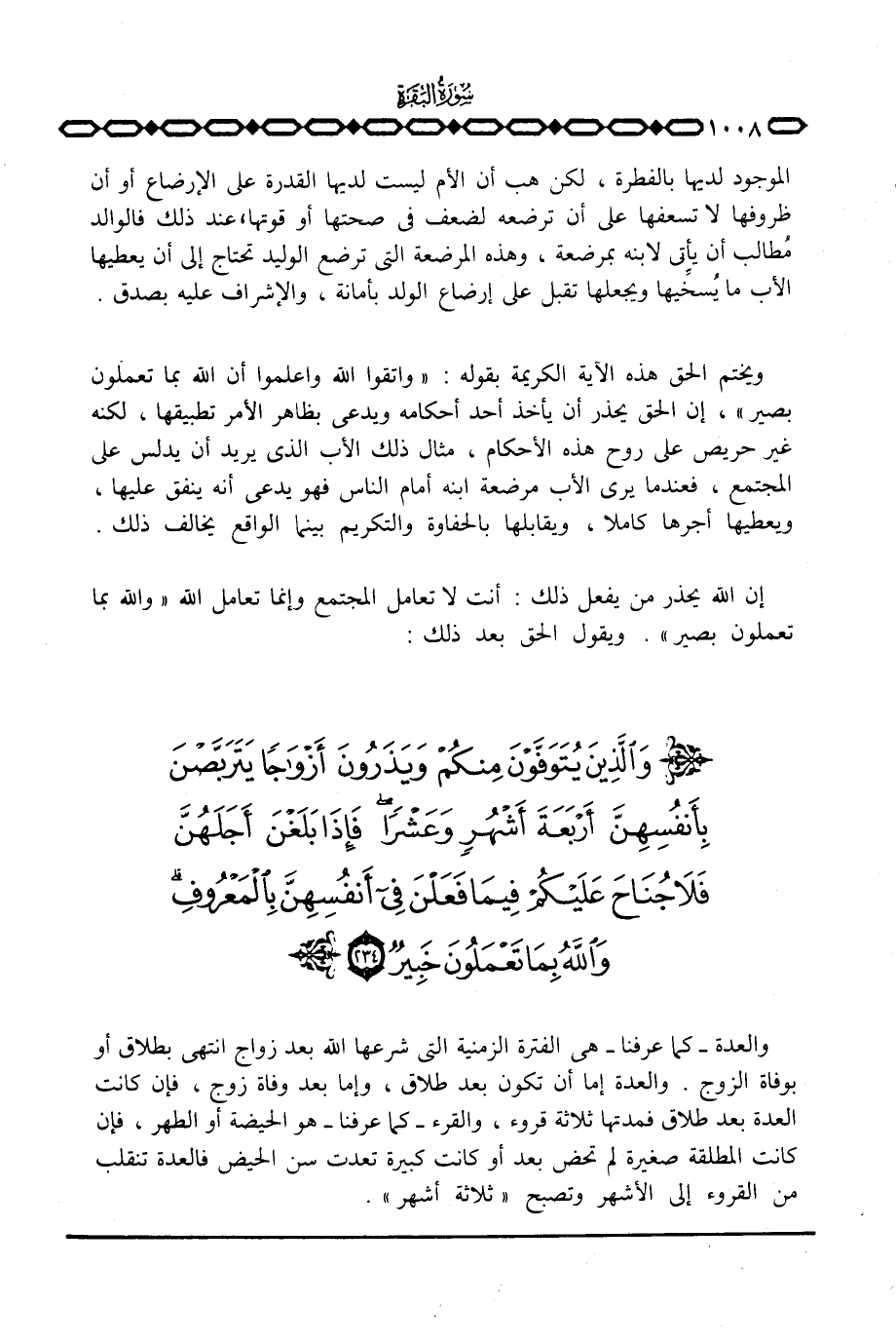 إن الله يحذر من يفعل ذلك: أنت لا تعامل المجتمع وإنما تعامل الله و {الله بِمَا تَعْمَلُونَ بَصِيرٌ} . ويقول الحق بعد ذلك: {والذين يُتَوَفَّوْنَ مِنكُمْ وَيَذَرُونَ أَزْوَاجاً يَتَرَبَّصْنَ بِأَنْفُسِهِنَّ أَرْبَعَةَ أَشْهُرٍ وَعَشْراً ... }
