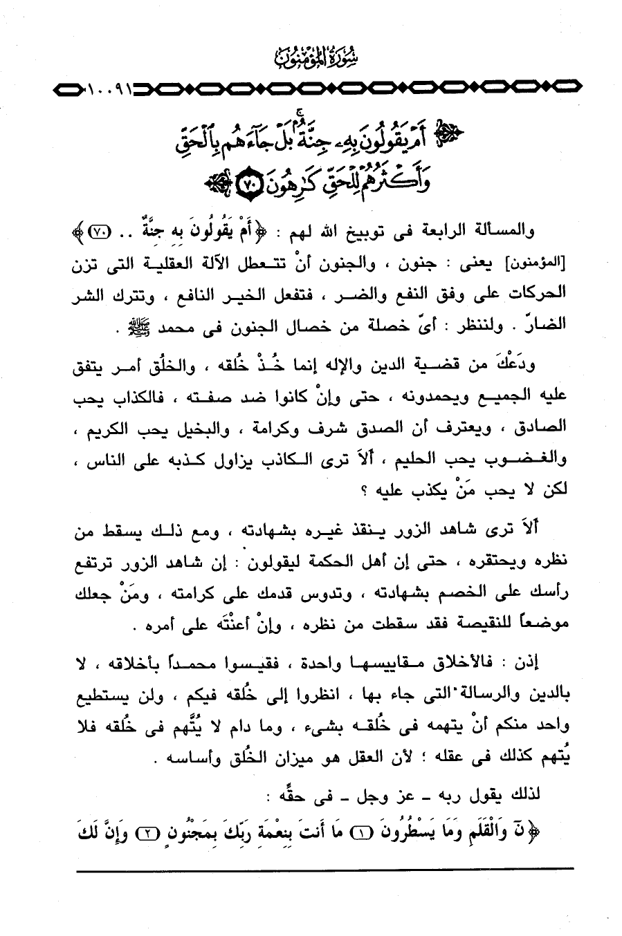 والمسألة الرابعة في توبيخ الله لهم: {أَمْ يَقُولُونَ بِهِ جِنَّةٌ. .} [المؤمنون: 70] يعني: جنون، والجنون أنْ تتعطل الآلة العقلية التي تزن الحركات على وفق النفع والضر، فتفعل الخير النافع، وتترك الشر الضارّ. ولننظر: أيّ خصلة من خصال الجنون في محمد صَلَّى اللَّهُ عَلَيْهِ وَسَلَّم َ.