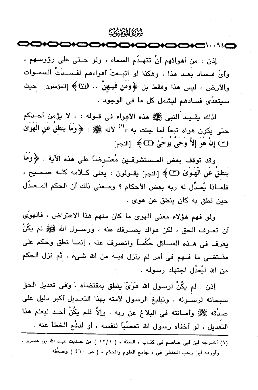 لذلك يقيد النبي صَلَّى اللَّهُ عَلَيْهِ وَسَلَّم َ هذه الأهواء في قوله: «لا يؤمن أحدكم حتى يكون هواه تبعاً لما جئت به» لأنه صَلَّى اللَّهُ عَلَيْهِ وَسَلَّم َ: {وَمَا يَنطِقُ عَنِ الهوى إِنْ هُوَ إِلاَّ وَحْيٌ يوحى} [النجم: 3 - 4] .