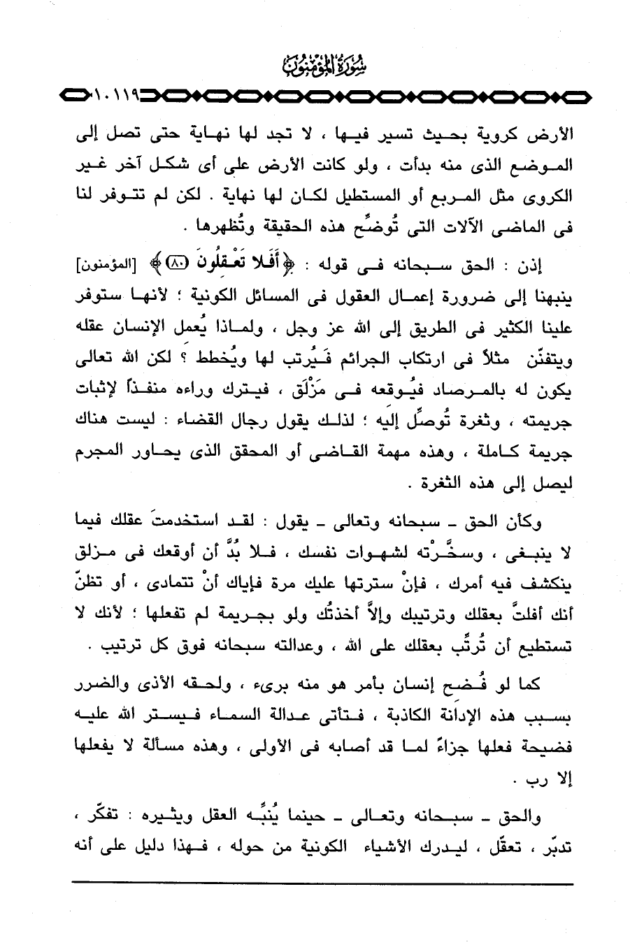 إذن: الحق سبحانه في قوله: {أَفَلاَ تَعْقِلُونَ} [المؤمنون: 80] ينبهنا إلى ضرورة إعمال العقول في المسائل الكونية؛ لأنها ستوفر علينا الكثير في الطريق إلى الله عَزَّ وَجَلَّ، ولماذا يُعمِل الإنسان عقله ويتفنّن مثلاً في ارتكاب الجرائم فَيُرتب لها ويُخطط؟ لكن الله تعالى يكون له بالمرصاد فيُوقِعه في مَزْلَق، فيترك وراءه منفذاً لإثبات جريمته، وثغرة تُوصِّل إليه؛ لذلك يقول رجال القضاء: ليست هناك جريمة كاملة، وهذه مهمة القاضي أو المحقق الذي يحاور المجرم ليصل إلى هذه الثغرة.
