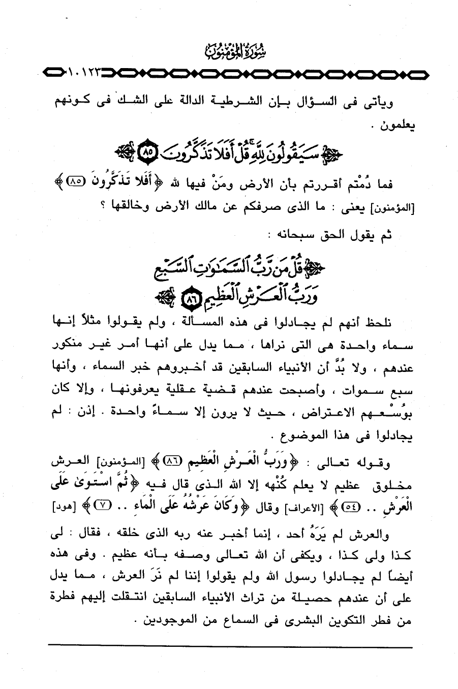 وقوله تعالى: {وَرَبُّ العرش العظيم} [المؤمنون: 86] العرش مخلوق عظيم لا يعلم كُنْهه إلا الله الذي قال فيه {ثُمَّ استوى عَلَى العرش. .} [الأعراف: 54] وقال {وَكَانَ عَرْشُهُ عَلَى المآء. .} [هود: 7] .