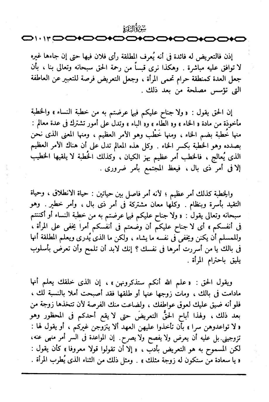 بل عليه أن يعرض ولا يفصح ولا يصرح. إن المواعدة في السر أمر منهي عنه، لكن المسموح به هو التعريض بأدب، {إِلاَّ أَن تَقُولُواْ قَوْلاً مَّعْرُوفاً} كأن يقول: «يا سعادة من ستكون له زوجة مثلك» . ومثل ذلك من الثناء الذي يُطرب المرأة.