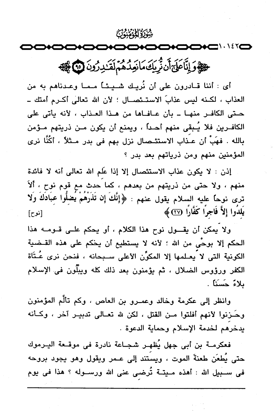 أي: أننا قادرون على أن نُريك شيئاً مما وعدناهم به من العذاب، لكنه ليس عذاب الاستئصال؛ لأن الله تعالى أكرم أمتك - حتى الكافر منها - بأن عافاها من هذا العذاب، لأنه يأتي على الكافرين فلا يُبقِي منهم أحداً، ويمنع أن يكون من ذريتهم مؤمن بالله. فهَبْ أن عذاب الاستئصال نزل بهم في بدر مثلاً، أكُنَّا نرى المؤمنين منهم ومن ذرياتهم بعد بدر؟
