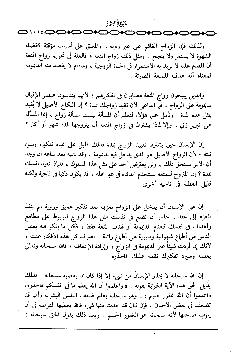 ولذلك فإن الزواج القائم على غير رويّة، والمعلق على أسباب مؤقتة كقضاء الشهوة لا يستمر ولا ينجح. ومثل ذلك زواج المتعة؛ فالعلة في تحريم زواج المتعة أن المقدم عليه لا يريد به الاستمرار في الحياة الزوجية، وما دام لا يقصد منه الديمومة فمعناه أنه هدف للمتعة الطارئة.