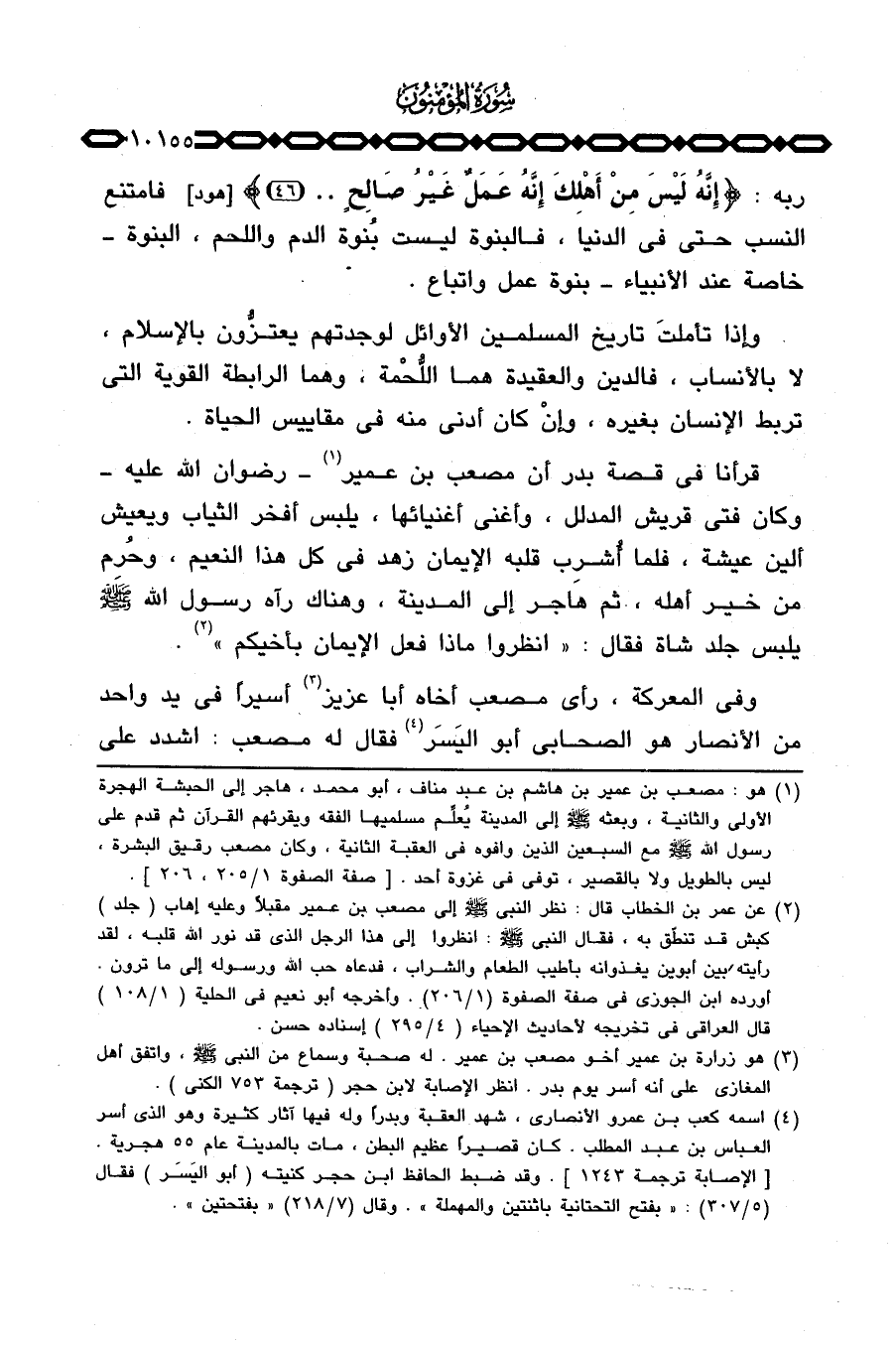 وإذا تأملتَ تاريخ المسلمين الأوائل لوجدتهم يعتزُّون بالإسلام، لا بالأنساب، فالدين والعقيدة هما اللُّحمْة، وهما الرابطة القوية التي تربط الإنسان بغيره، وإنْ كان أدنى منه في مقاييس الحياة.