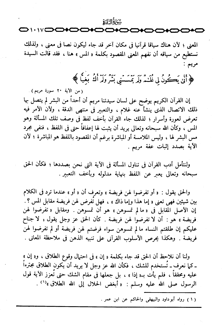 إن القرآن الكريم يوضح على لسان سيدتنا مريم أن أحداً من البشر لم يتصل بها ذلك الاتصال الذي ينشأ عنه غلام، والتعبير في منتهى الدقة، ولأن الأمر فيه تعرض لعورة وأسرار؛ لذلك جاء القرآن بأخف لفظ في وصف تلك المسألة وهو المس، وكأن الله سبحانه وتعالى يريد أن يثبت لها إعفافاً حتى في اللفظ، فنفى مجرد مس البشر لها، وليس الملامسة أو المباشرة برغم أن المقصود باللفظ هو المباشرة؛ لأن الآية بصدد إثبات عفة مريم.