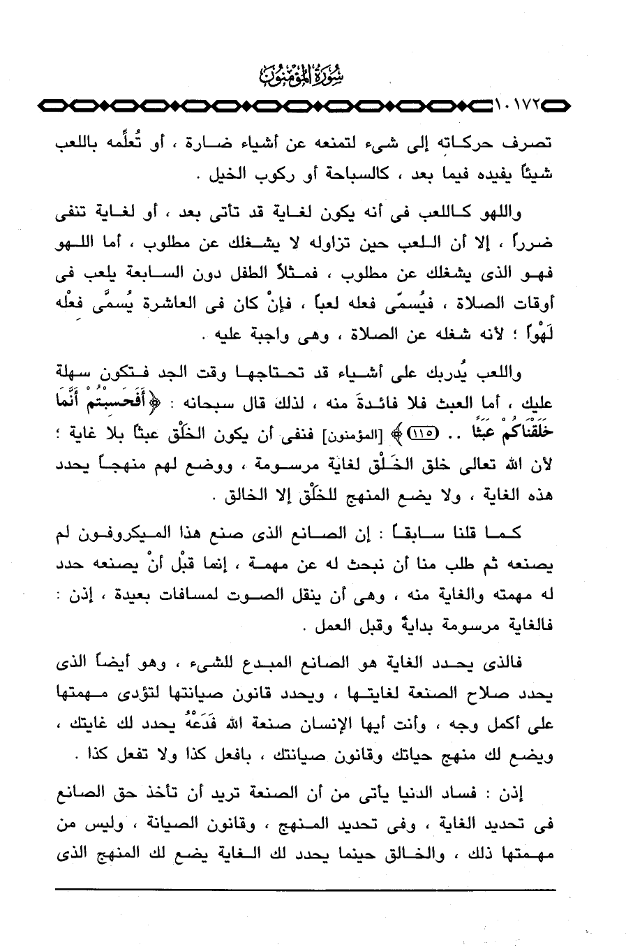 واللعب يُدربك على أشياء قد تحتاجها وقت الجد فتكون سهلة عليك، أما العبث فلا فائدةَ منه، لذلك قال سبحانه: {أَفَحَسِبْتُمْ أَنَّمَا خَلَقْنَاكُمْ عَبَثاً. .} [المؤمنون: 115] فنفي أن يكون الخَلْق عبثاً بلا غاية؛ لأن الله تعالى خلق الخَلْق لغاية مرسومة، ووضع لها منهجاً يحدد هذه الغاية، ولا يضع المنهج للخَلْق إلا الخالق.