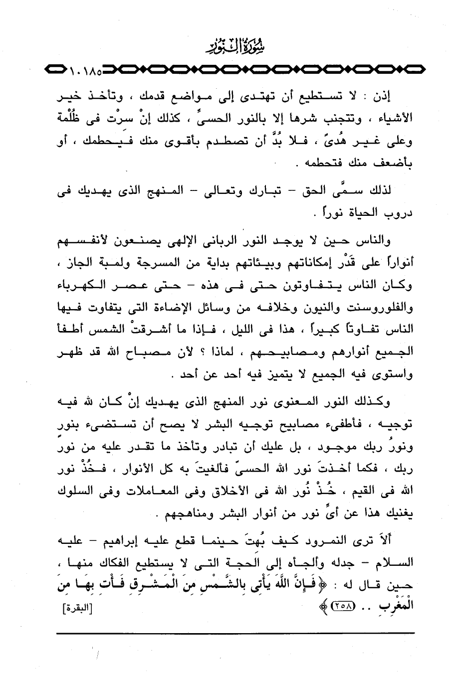 وكذلك النور المعنوي نور المنهج الذي يهديك إنْ كان لله فيه توجيه، فأطفيء مصابيح توجيه البشر لا يصح أن تستضيء بنور ونورُ ربك موجود، بل عليك أن تبادر وتأخذ ما تقدر عليه من نور ربك، فكما أخذتَ نور الله الحسيّ فألغيتَ به كل الأنوار، فخُذْ نور الله في القيم، خُذْ نُور الله في الأخلاق وفي المعاملات وفي السلوك يغنيك هذا عن أيِّ نور من أنوار البشر ومناهجهم.