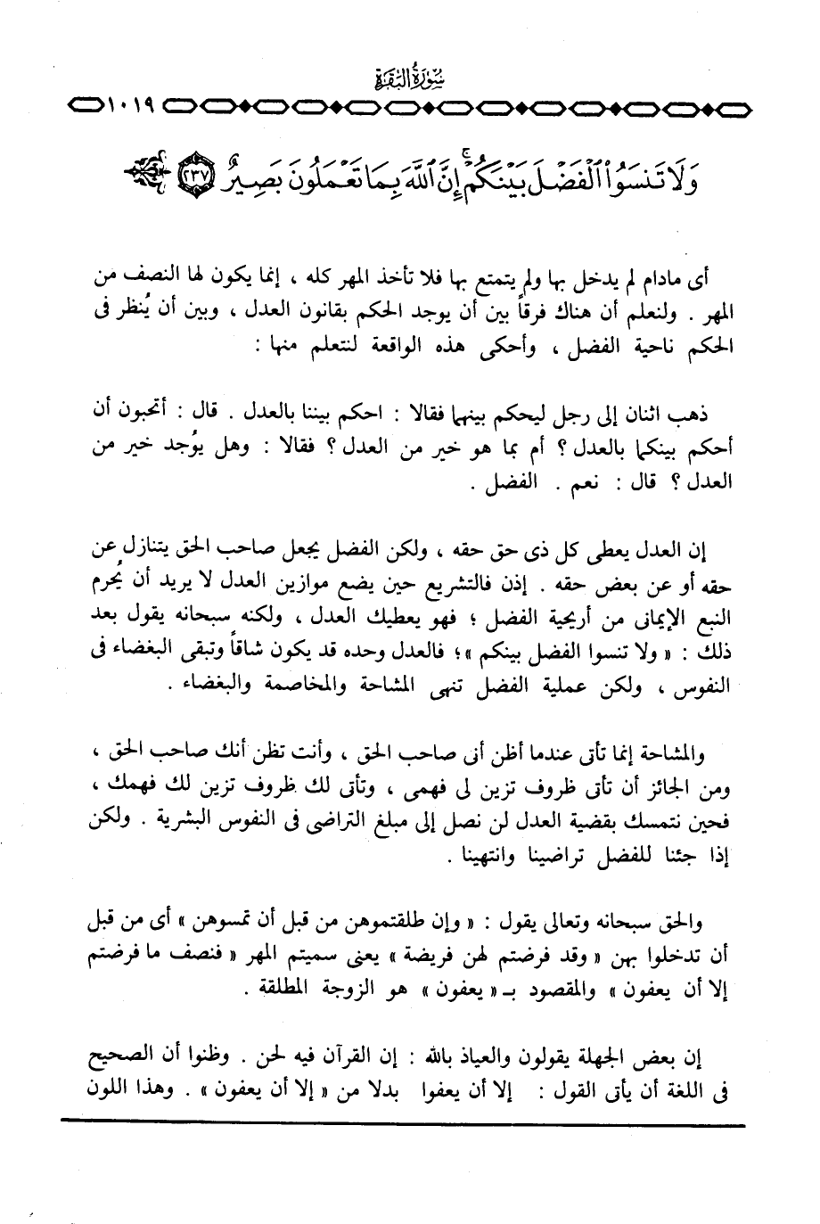 إن العدل يعطي كل ذي حق حقه، ولكن الفضل يجعل صاحب الحق يتنازل عن حقه أو عن بعض حقه. إذن فالتشريع حين يضع موازين العدل لا يريد أن يحرم النبع الإيماني من أريحية الفضل؛ فهو يعطيك العدل، ولكنه سبحانه يقول بعد ذلك: {وَلاَ تَنسَوُاْ الفضل بَيْنَكُمْ} ؛ فالعدل وحده قد يكون شاقاً وتبقى البغضاء في النفوس، ولكن عملية الفضل تنهي المشاحة والمخاصمة والبغضاء.
