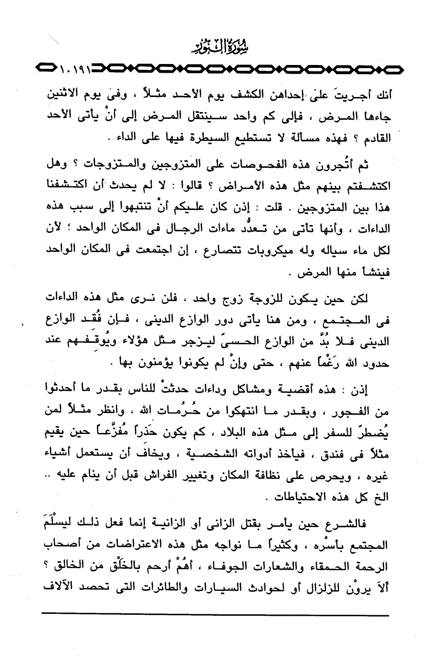 ثم أتُجرون هذه الفحوصات على المتزوجين والمتزوجات؟ وهل اكتشفتم بينهم مثل هذه الأمراض؟ قالوا: لا لم يحدث أن اكتشفنا هذا بين المتزوجين. قلت: إذن كان عليكم أنْ تنتبهوا إلى سبب هذه الداءات، وأنها تأتي من تعدُّد ماءات الرجال في المكان الواحد؛ لأن كل ماء سياله وله ميكروبات تتصارع، إن اجتمعت في المكان الواحد فينشأ منها المرض.
