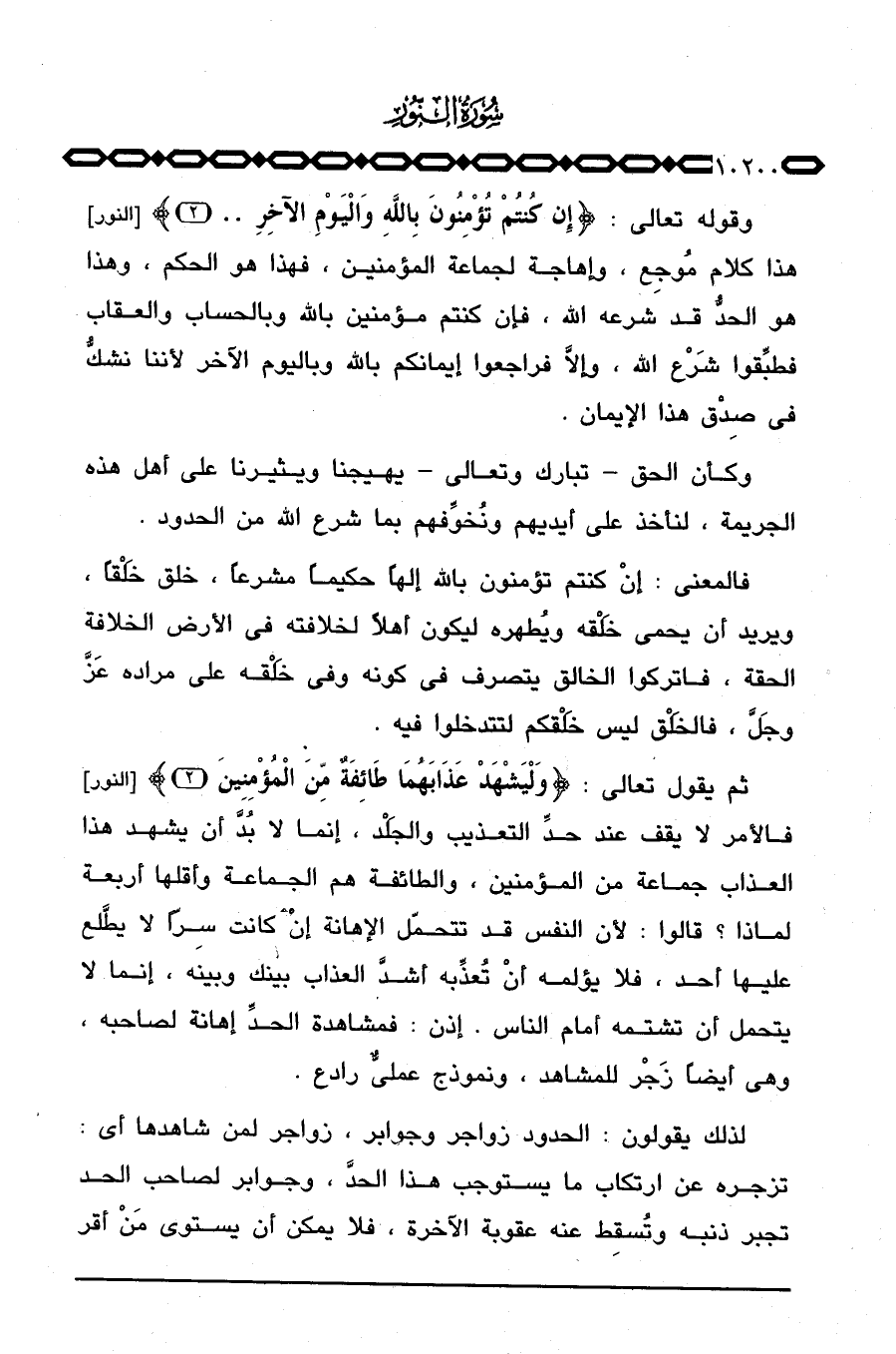 ثم يقول تعالى: {وَلْيَشْهَدْ عَذَابَهُمَا طَآئِفَةٌ مِّنَ المؤمنين} [النور: 2] فالأمر لا يقف عند حدِّ التعذيب والجَلْد، إنما لا بُدَّ أن يشهد هذا العذاب جماعة من المؤمنين، والطائفة هم الجماعة وأقلها أربعة لماذا؟ قالوا: لأن النفس قد تتحمّل الإهانة إنْ كانت سِراً لا يطَّلع عليها أحد، فلا يؤلمه أنْ تُعذِّبه أشدَّ العذاب بينك وبينه، إنما لا يتحمل أن تشتمه أمام الناس. إذن: فمشاهدة الحدِّ إهانة لصاحبه، وهي أيضاً زَجْر للمشاهد، ونموذج عمليٌّ رادع.