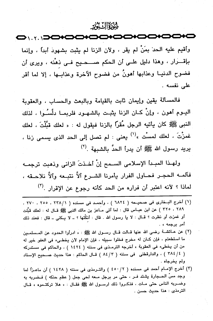 ولهذا المبدأ الإسلامي السمح إنْ أخذتَ الزاني وذهبت ترجمه فآلمه الحجر فحاول الفرار يأمرنا الشرع ألاَّ نتبعه وألاَّ نلاحقه، لماذا؟ لأنه اعتبر أن فراره من الحد كأنه رجوع عن الإقرار.