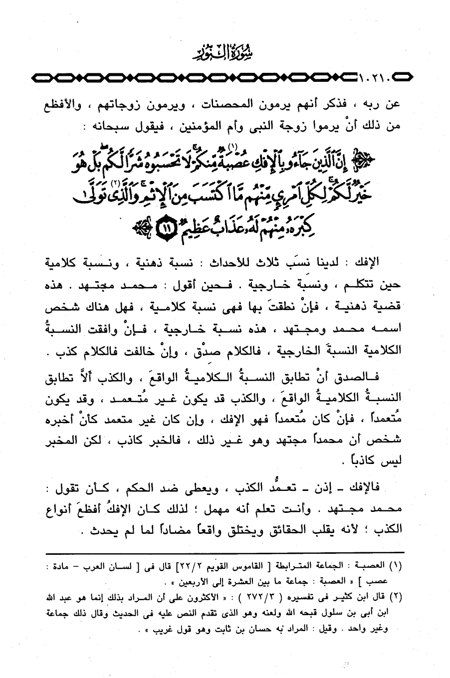 الإفك: لدينا نِسَب ثلاث للأحداث: نسبة ذهنية، ونسبة كلامية حين تتكلم، ونسبة خارجية. فحين أقول: محمد مجتهد. هذه قضية ذهنية، فإن نطقتَ بها فهي نسبة كلامية، فهل هناك شخص اسمه محمد ومجتهد، هذه نسبة خارجية، فإنْ وافقت النسبةُ الكلامية النسبةَ الخارجية، فالكلام صِدْق، وإنْ خالفت فالكلام كذب.