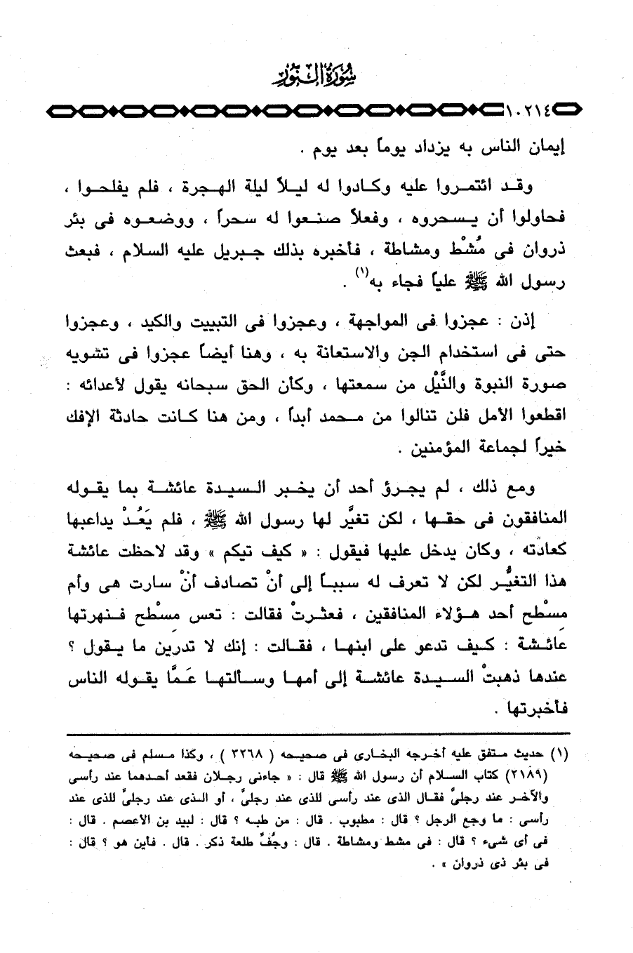 «لم يجرؤ أحد أن يخبر السيدة عائشة بما يقوله المنافقون في حقها، لكن تغيَّر لها رسول الله صَلَّى اللَّهُ عَلَيْهِ وَسَلَّم َ، فلم يَعُدْ يداعبها كعادته، وكان يدخل عليها فيقول:» كيف تيكم «وقد لاحظت عائشة هذا التغيُّر لكن لا تعرف له سبباً إلى أنْ تصادف أنْ سارت هي وأم مِسْطح أحد هؤلاء المنافقين، فعثرتْ فقالت: تعس مِسْطح فنهرتها عائشة: كيف تدعو على ابنها، فقالت: إنك لا تدرين ما يقول؟ عندها ذهبتْ السيدة عائشة إلى أمها وسألتها عَمَّا يقوله الناس فأخبرتها.