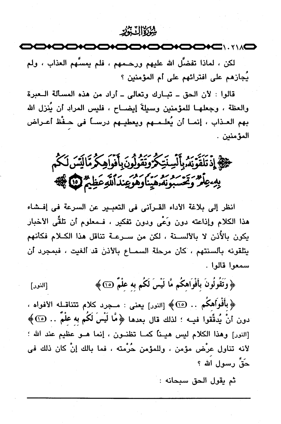 انظر إلى بلاغة الأداء القرآني في التعبير عن السرعة في إفشاء هذا الكلام وإذاعته دون وَعْي ودون تفكير، فمعلوم أن تلقِّي الأخبار يكون بألأُذن لا بالألسنة، لكن من سرعة تناقل هذا الكلام فكأنهم يتلقونه بألسنتهم، كأن مرحلة السماع بالأذن قد ألغيت، فبمجرد أن سمعوا قالوا.