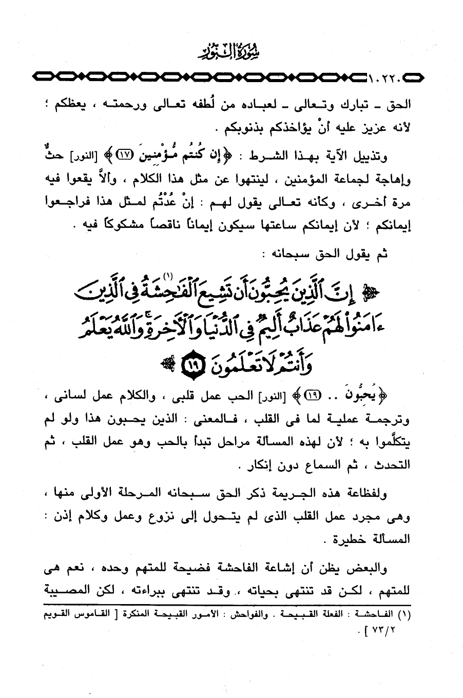 {يُحِبُّونَ. .} [النور: 19] الحب عمل قلبي، والكلام عمل لساني، وترجمة عملية لما في القلب، فالمعنى: الذين يحبون هذا ولو لم يتكلَّموا به؛ لأن لهذه المسألة مراحل تبدأ بالحب وهو عمل القلب، ثم التحدث، ثم السماع دون إنكار.