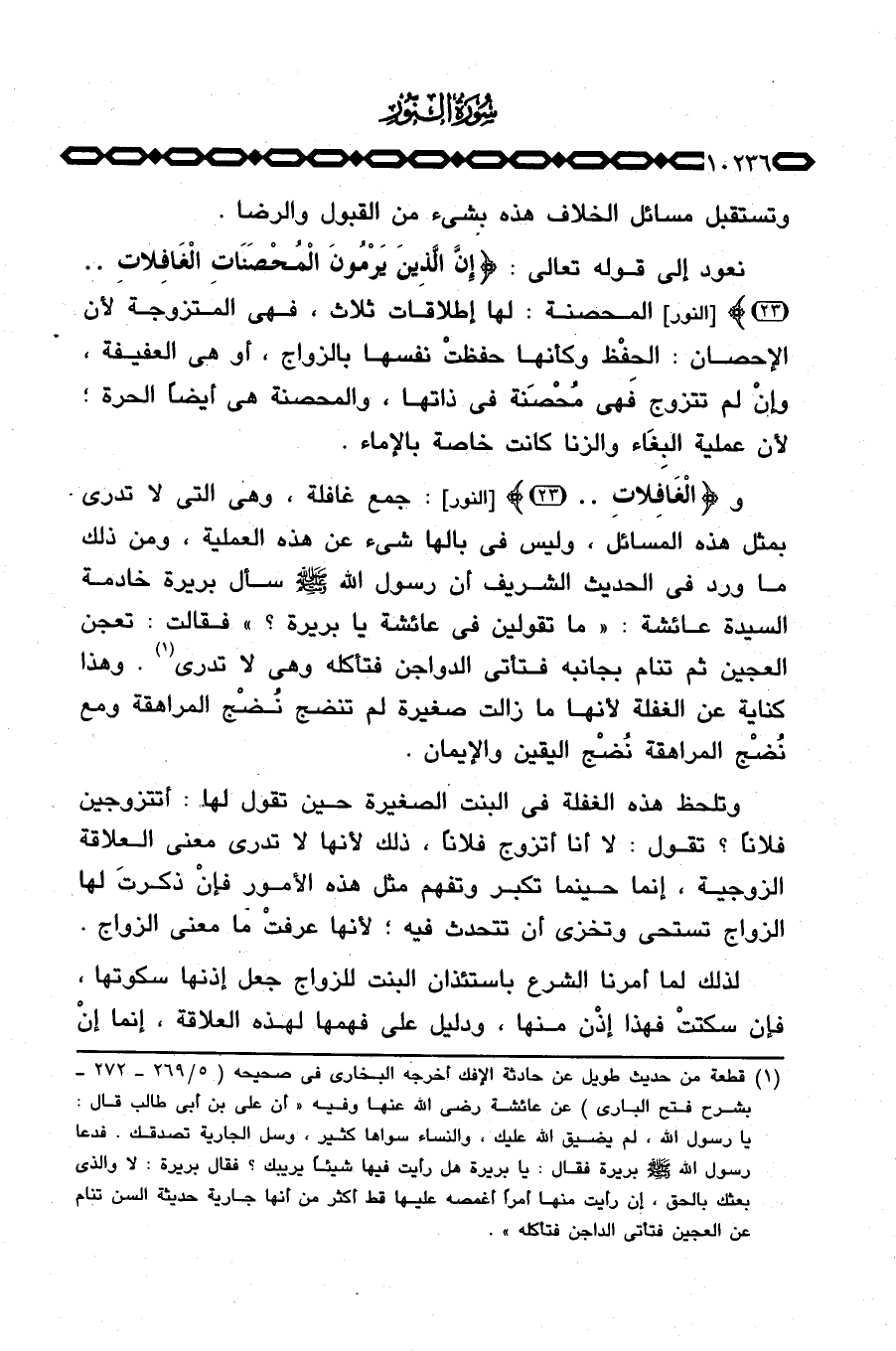 و {الغافلات. .} [النور: 23] جمع غافلة، وهي التي لا تدري بمثل هذه المسائل، وليس في بالها شيء عن هذه العملية، ومن ذلك ما ورد في الحديث الشريف «أن رسول الله صَلَّى اللَّهُ عَلَيْهِ وَسَلَّم َ سأل بريرة خادمة السيدة عائشة: ما تقولين في عائشة يا بريرة؟ فقالت: تعجن العجين ثم تنام بجانبه فتأتي الدواجن فتأكله وهي لا تدري» وهذا كناية عن الغفلة لأنها ما زالت صغيرة لم تنضج نُضْج المراهقة ومع نُضْج المراهقة نُضْج اليقين والإيمان.