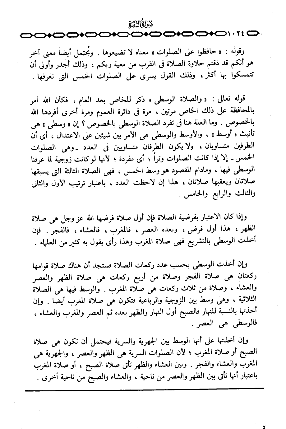 قوله تعالى: {والصلاة الوسطى} ذكر للخاص بعد العام، فكأن الله أمر بالمحافظة على ذلك الخاص مرتين، مرة في دائرة العموم ومرة أخرى أفردها الله بالخصوص. وما العلة هنا في تفرد الصلاة الوسطى بالخصوص؟ إن «وسطى» هي تأنيث «أوسط» ، والأوسط والوسطى هي الأمر بين شيئين على الاعتدال، أي أن الطرفين متساويان، ولا يكون الطرفان متساويين في العدد وهي الصلوات الخمس إلا إذا كانت الصلوات وتراً؛ أي مفردة؛ لأنها لو كان زوجية لما عرفنا الوسطى فيها، ومادام المقصود هو وسط الخمس، فهي الصلاة الثالثة التي يسبقها صلاتان ويعقبها صلاتان، هذا إن لاحظت العدد، باعتبار ترتيب الأول والثاني والثالث والرابع والخامس.