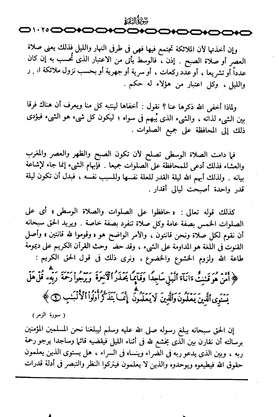 كذلك قوله تعالى: {حَافِظُواْ عَلَى الصلوات والصلاة الوسطى} أي على الصلوات الخمس بصفة عامة وكل صلاة تنفرد بصفة خاصة. ويريد الحق سبحانه أن نقوم لكل صلاة ونحن قانتون، والأمر الواضح هو {وَقُومُواْ للَّهِ قَانِتِينَ} وأصل القنوات في اللغة هو المداومة على الشيء، وقد حضر وحث القرآن الكريم على ديمومة طاعة الله ولزوم الخشوع والخضوع، ونرى ذلك في قول الحق الكريم: {أَمَّنْ هُوَ قَانِتٌ آنَآءَ اليل سَاجِداً وَقَآئِماً يَحْذَرُ الآخرة وَيَرْجُواْ رَحْمَةَ رَبِّهِ قُلْ هَلْ يَسْتَوِي الذين يَعْلَمُونَ والذين لاَ يَعْلَمُونَ إِنَّمَا يَتَذَكَّرُ أُوْلُواْ الألباب} [الزمر: 9]
